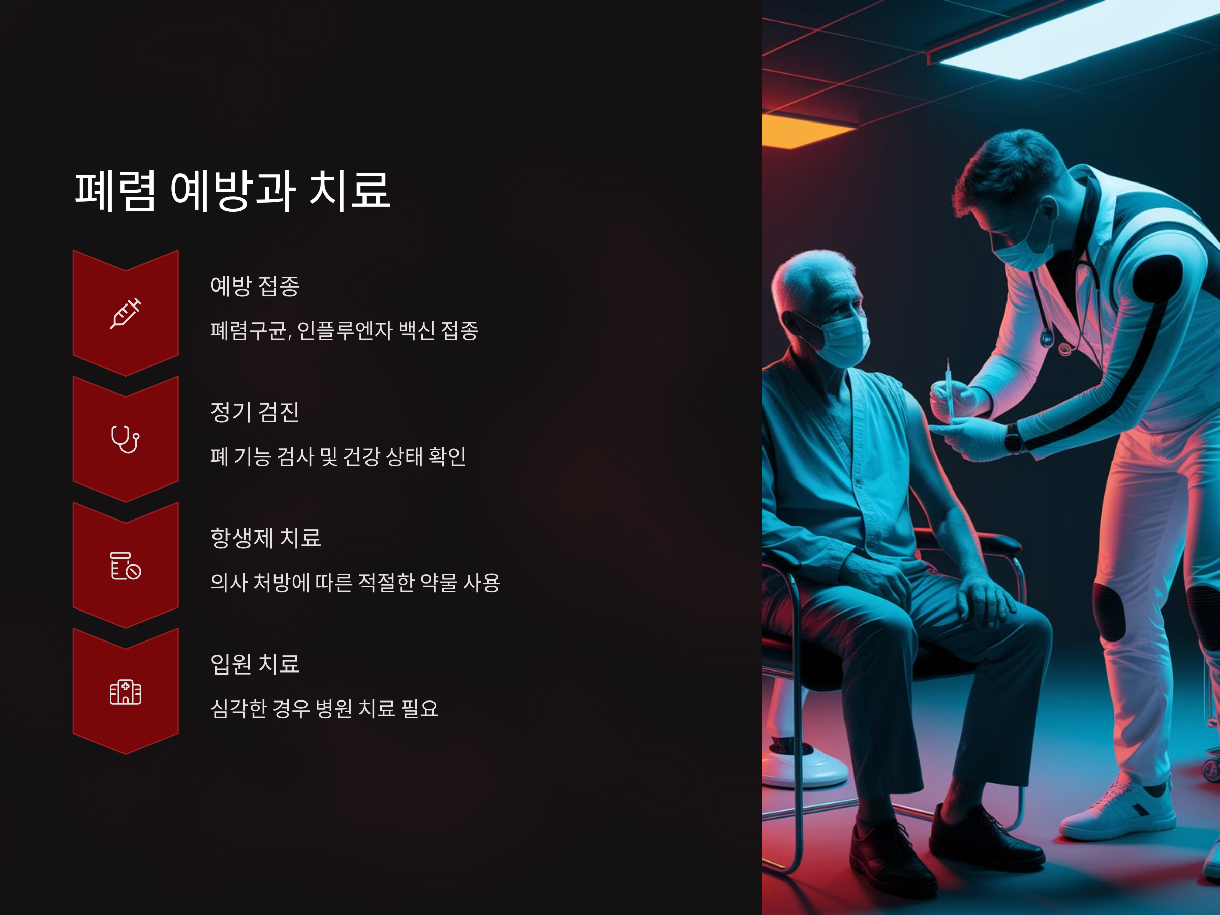 폐렴 예방을 위해 폐렴구균 백신과 인플루엔자 백신이 중요합니다. 특히 만성 호흡기 질환이 있는 환자에게 유용합니다.