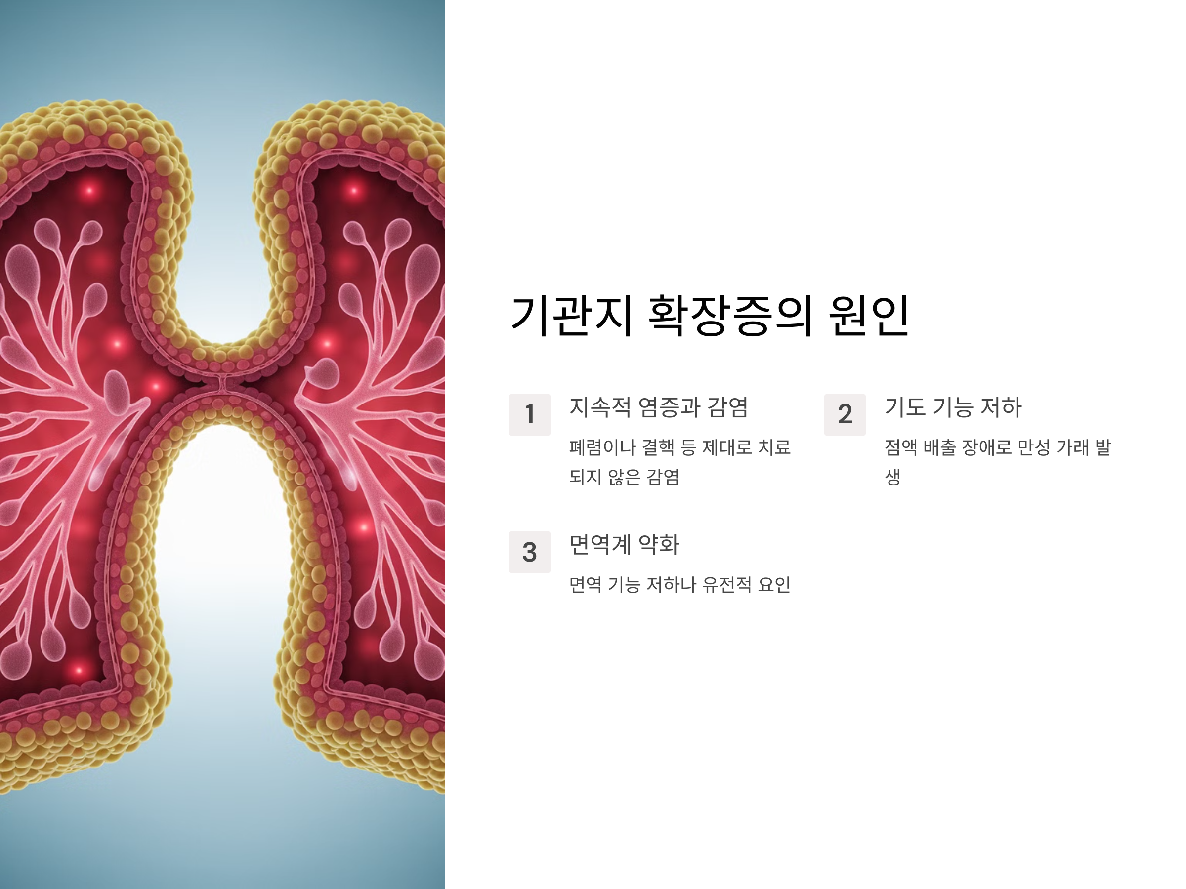 기관지 확장증은 만성적으로 기도에 염증과 감염이 반복되면서 기도가 늘어나고 확장되는 상태입니다. 이로 인해 폐에서 점액이 적절히 배출되지 않거나, 비정상적으로 많은 점액이 생성되어 기도를 막을 수 있습니다. 만약 이러한 상태가 지속되면 가래와 혈담이 자주 발생하게 되며, 이는 환자에게 큰 불편을 초래할 수 있습니다.