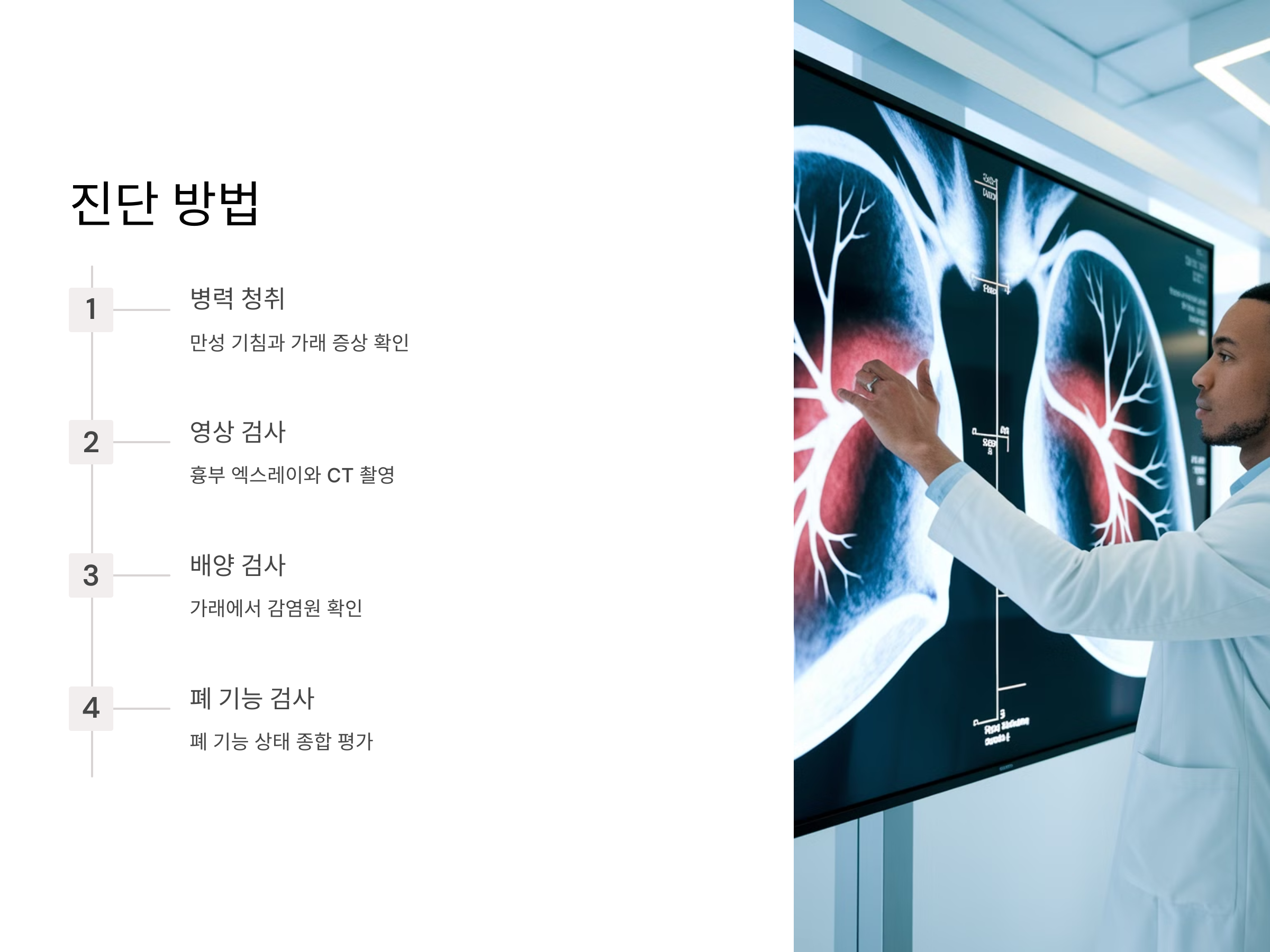 기관지 확장증은 주로 병력 청취와 신체검사를 통해 의심됩니다. 환자가 만성적인 기침과 가래를 호소하고, 때때로 혈담을 뱉는다면, 의사는 먼저 흉부 엑스레이나 CT 촬영을 진행할 수 있습니다. CT 촬영은 기관지의 확장 정도와 폐의 상태를 상세히 확인할 수 있어, 정확한 진단에 도움이 됩니다.
