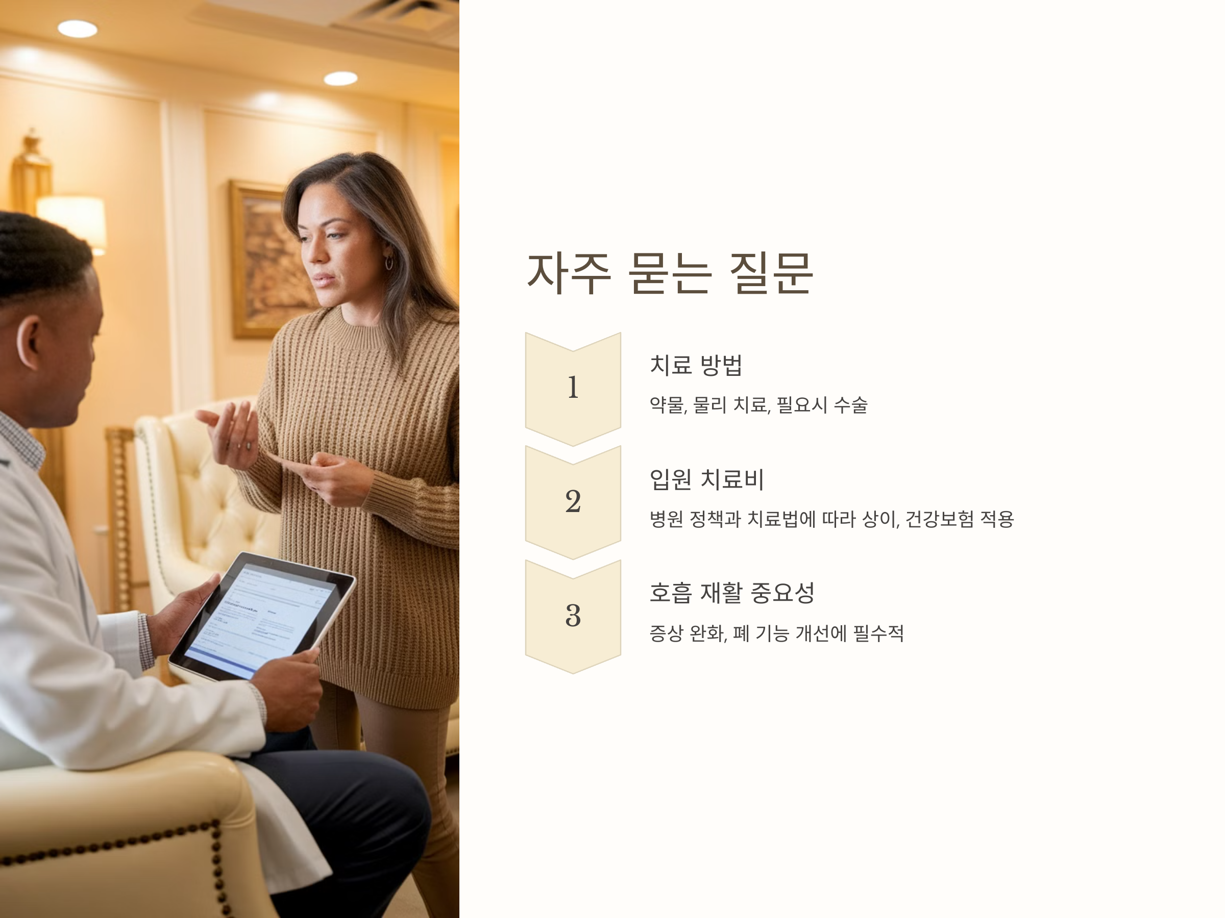 기관지 확장증은 만성적인 호흡기 질환으로, 조기 진단과 꾸준한 관리가 중요합니다. 입원 치료비와 관련된 건강보험 적용 범위를 충분히 이해하고, 호흡 재활 치료를 통해 질환의 진행을 예방하는 것이 필요합니다. 무엇보다 중요한 것은 환자 본인의 적극적인 치료 참여와 올바른 생활 습관입니다.