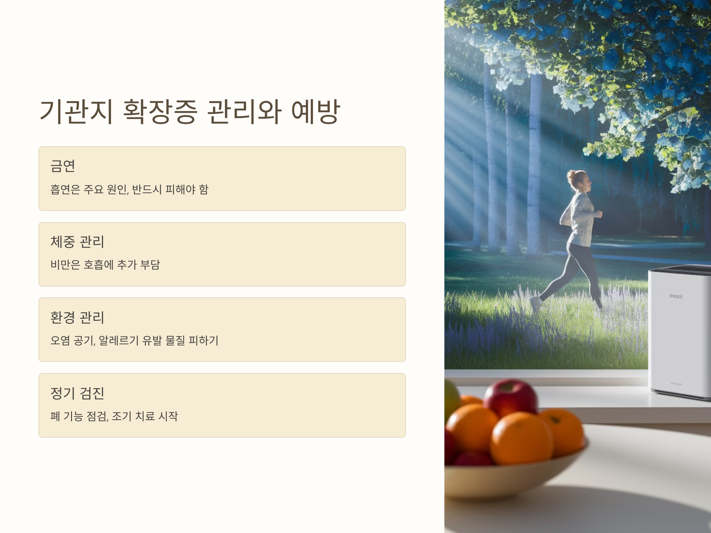 기관지 확장증은 일상적인 관리와 예방이 중요합니다. 치료 후에도 증상이 재발하거나 악화되지 않도록 주의 깊은 관리가 필요합니다. 주요 예방 방법은 다음과 같습니다: