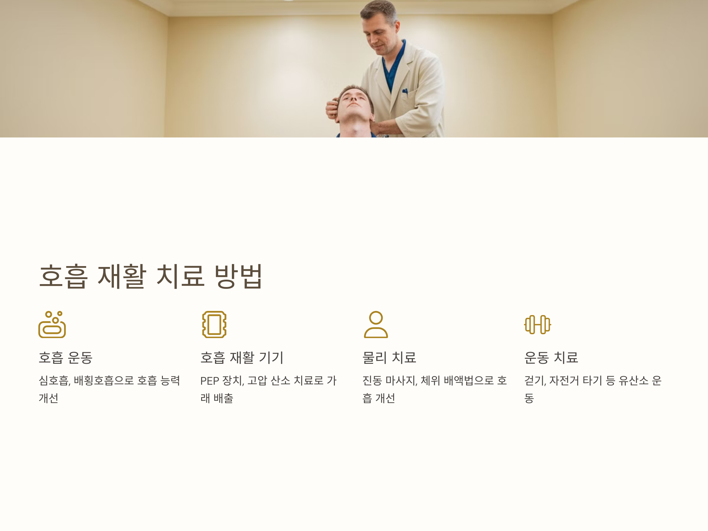 - 운동 치료: 환자가 운동을 통해 전반적인 신체 건강을 개선하고, 호흡에 필요한 체력을 키울 수 있도록 돕습니다. 걷기, 자전거 타기 등 유산소 운동을 포함한 치료가 효과적입니다.