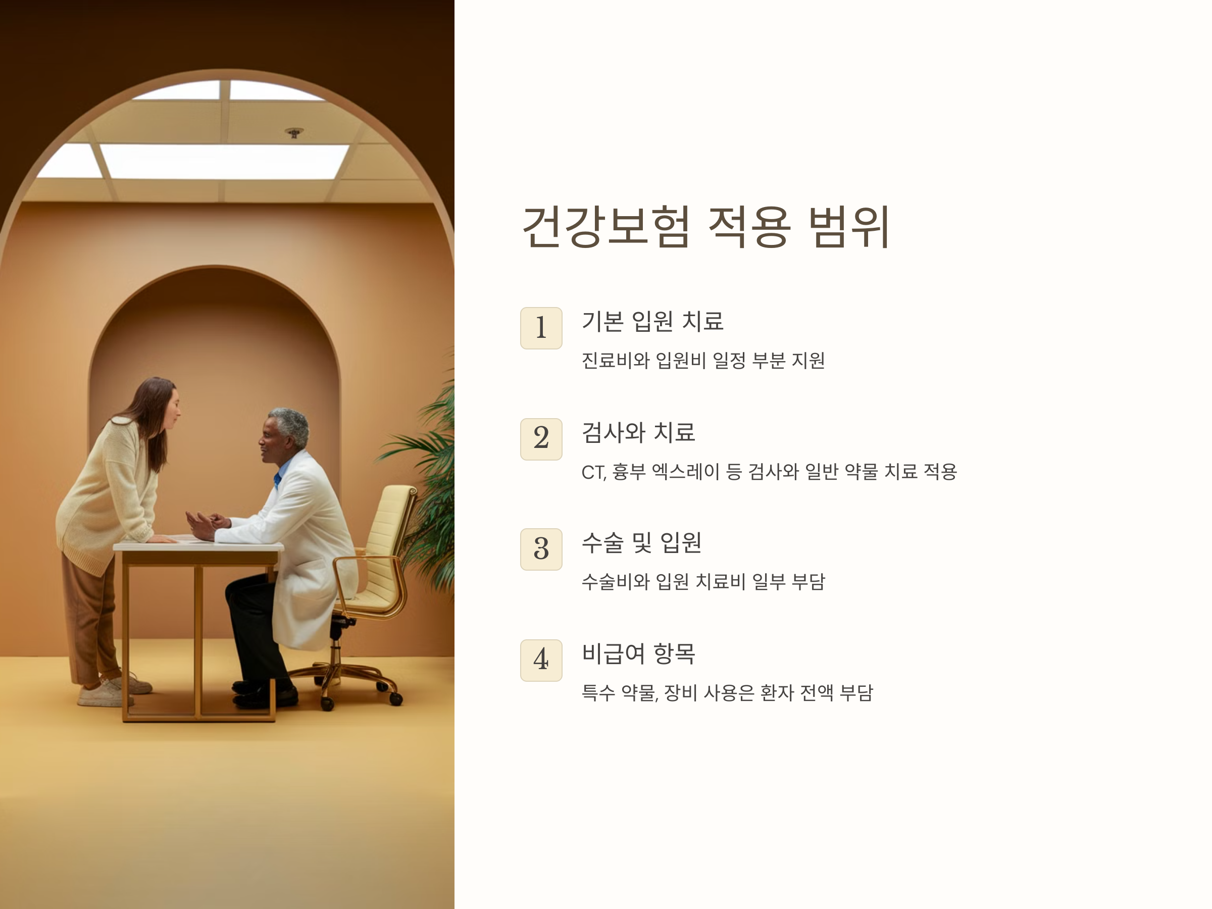 - 병원에서의 기본적인 입원 치료: 건강보험은 진료비와 입원비의 일정 부분을 지원합니다. 이를 통해 환자는 치료를 받을 수 있습니다.