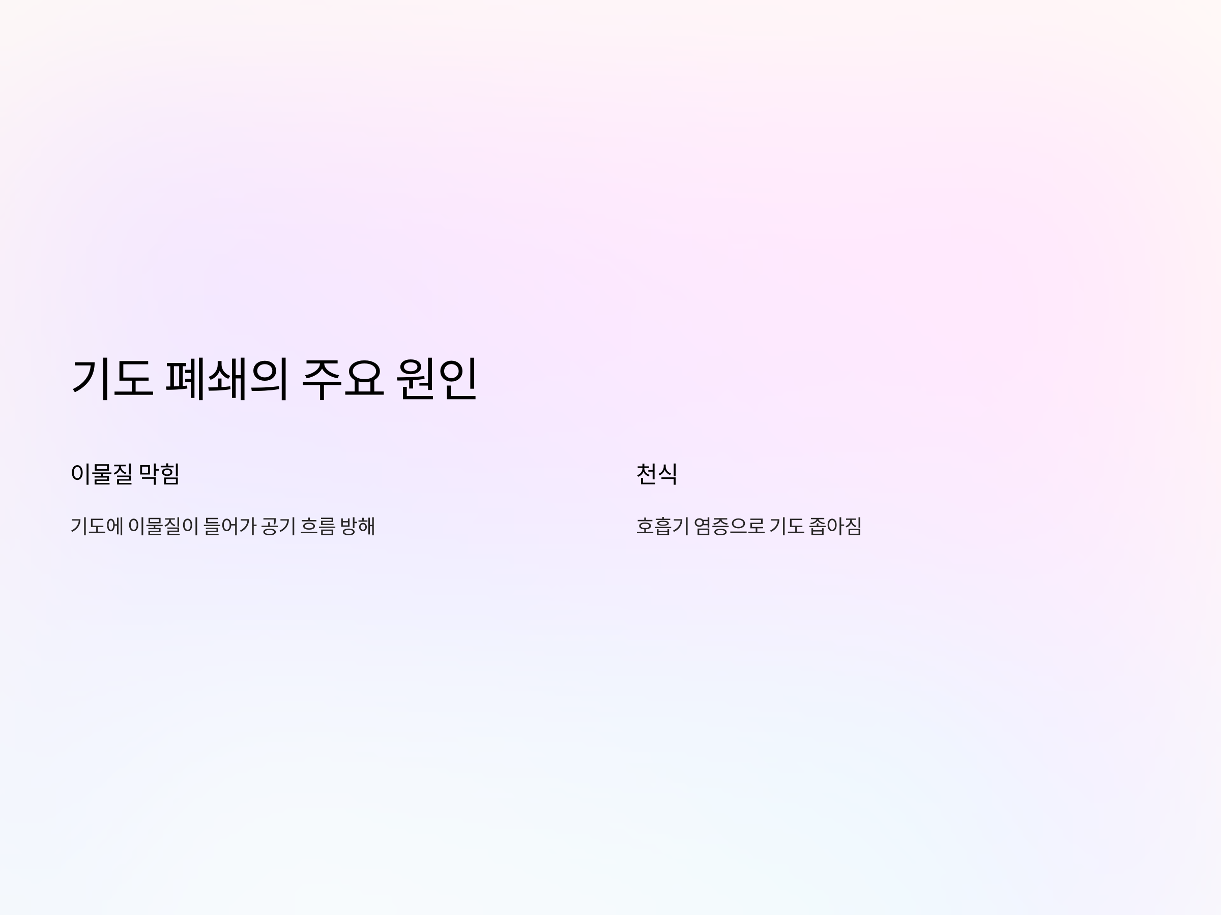 기도 폐쇄는 다양한 원인에 의해 발생할 수 있습니다. 기도가 부분적으로 막히거나 좁아지면 호흡이 어려워지며, 쇳소리 또는 쌕쌕 소리가 나게 됩니다. 주된 원인으로는 아래와 같은 것들이 있습니다.