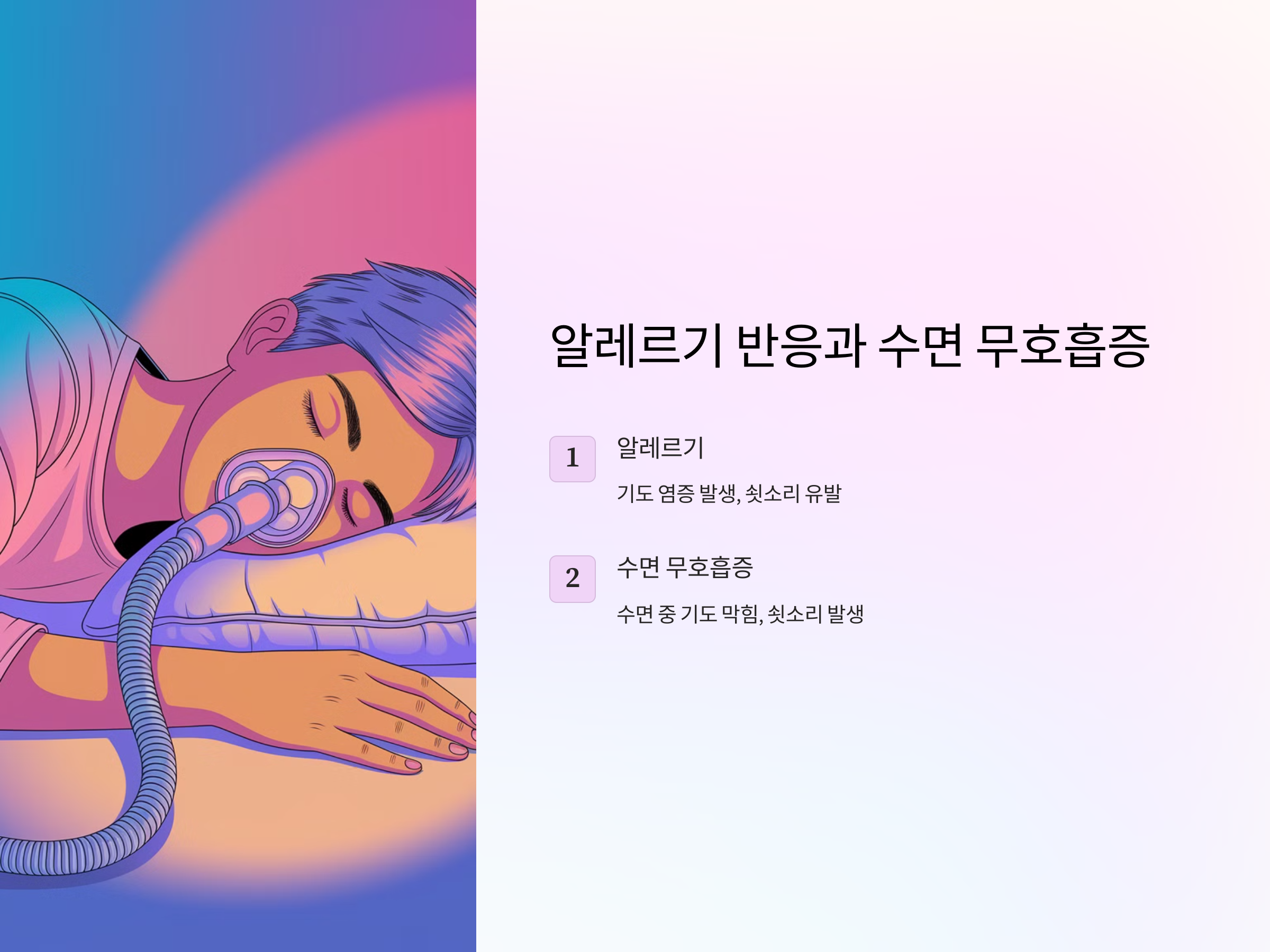 알레르기 반응으로 인해 기도의 염증이 발생하면 기도가 좁아지고, 이로 인해 숨을 쉴 때 쇳소리가 날 수 있습니다. 특히 꽃가루, 먼지, 동물의 털 등 알레르기 유발 물질에 반응할 때 이러한 증상이 나타날 수 있습니다. 알레르기 증상이 심해지면 기도가 더욱 좁아져 호흡에 어려움을 겪을 수 있습니다.
