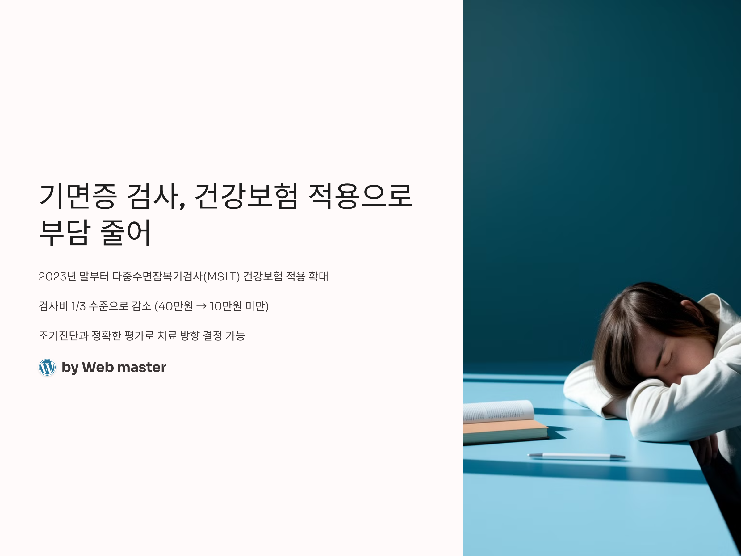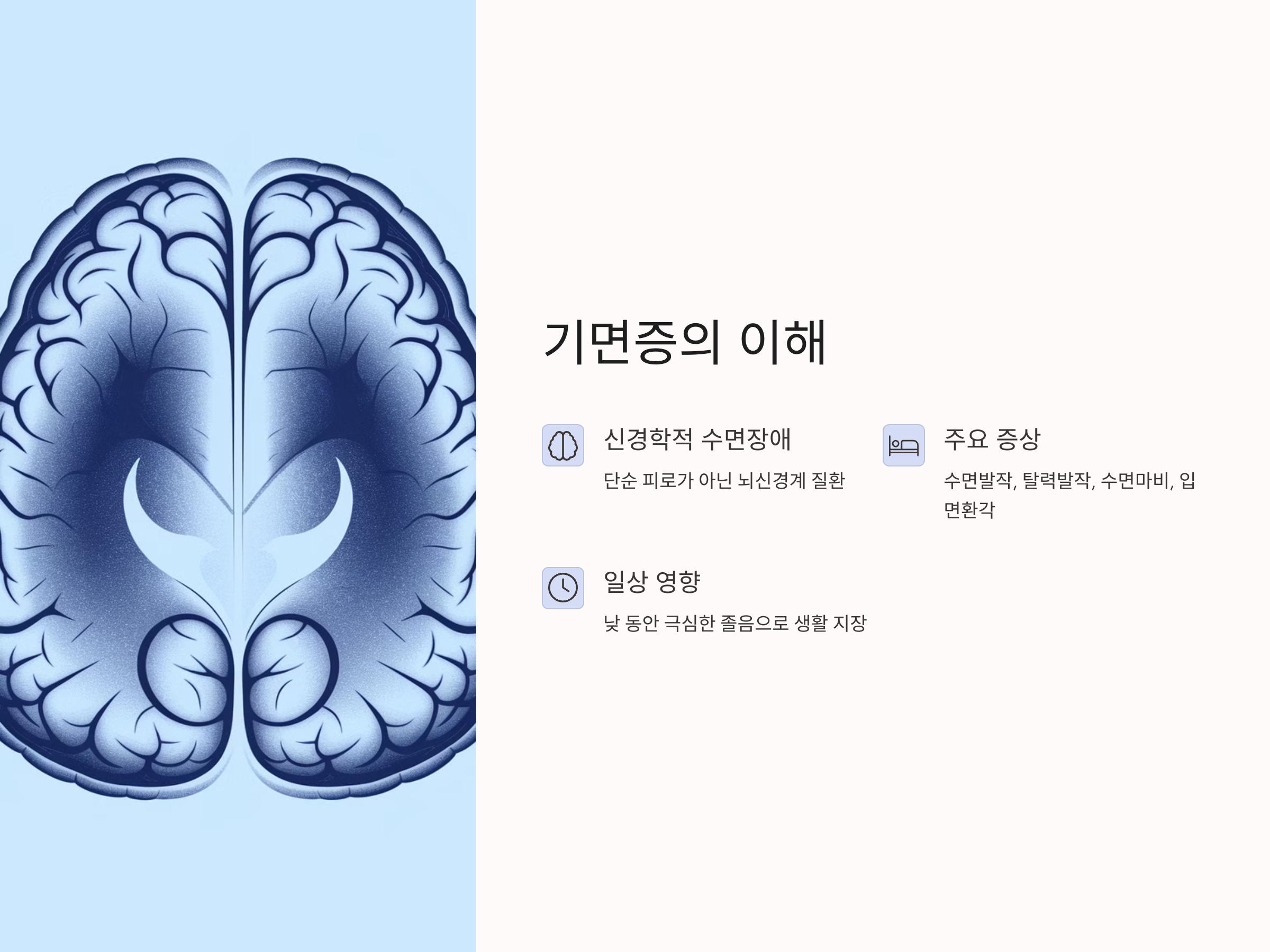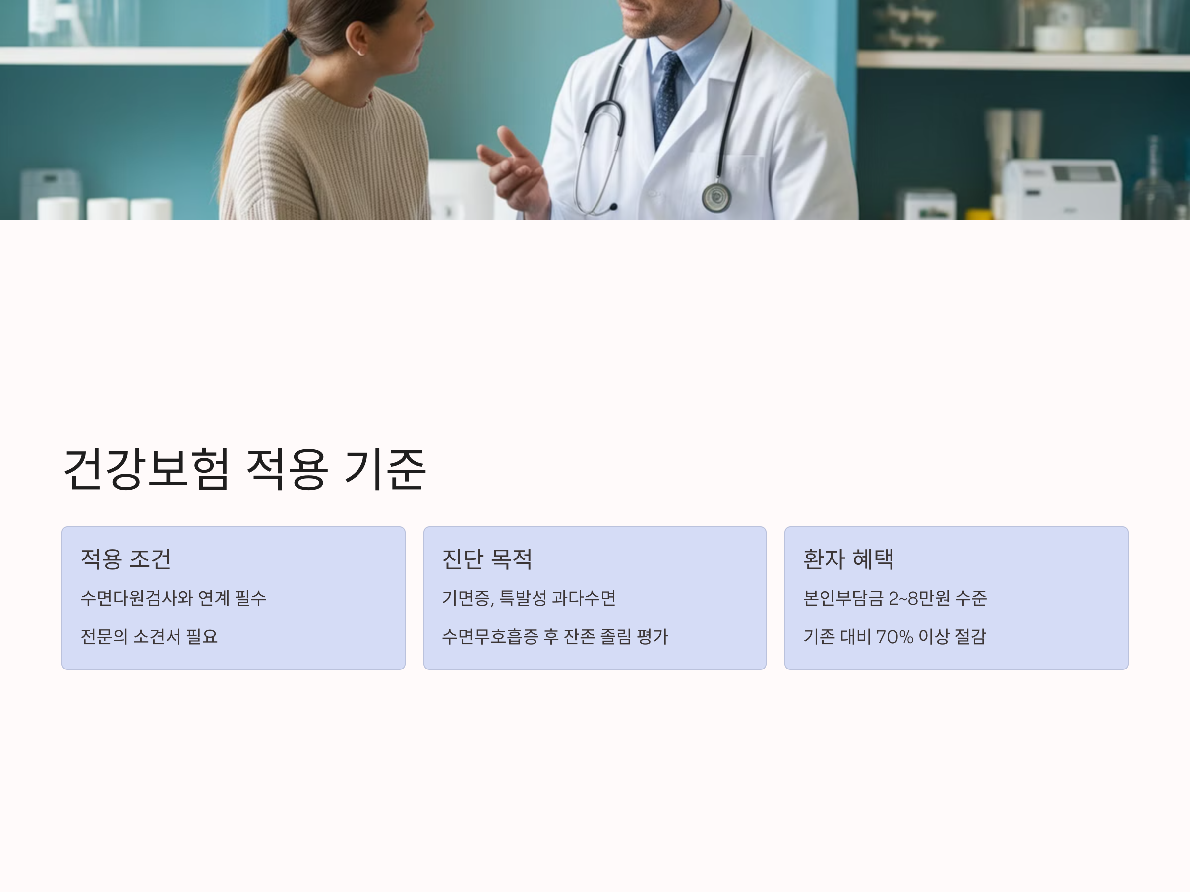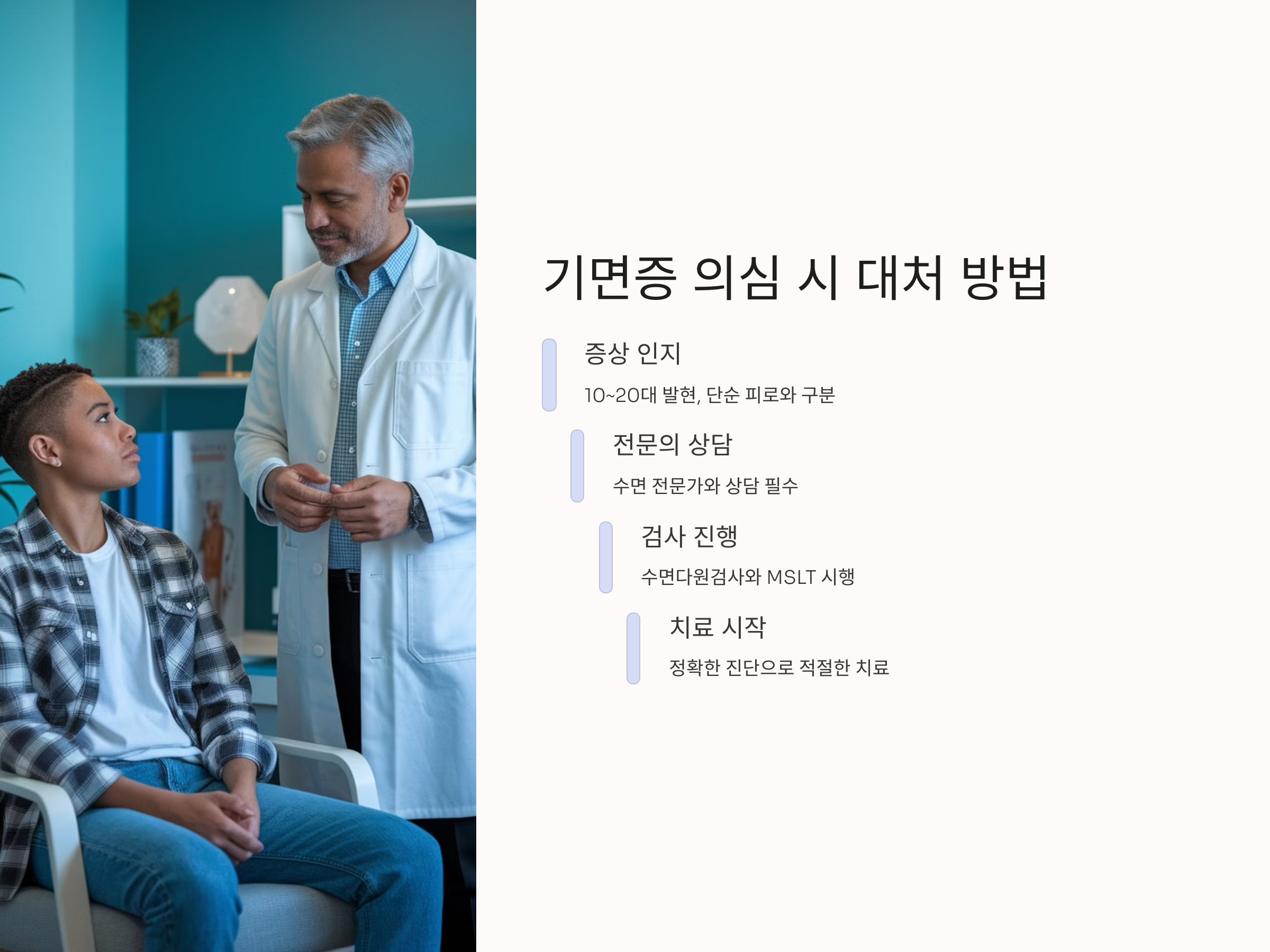 정확한 진단은 기면증을 단순 졸림에서 '치료 가능한 질환'으로 바꾸는 열쇠입니다. 건강보험이 적용되는 지금이야말로 부담 없이 검사를 받을 수 있는 최적의 시기이며, 수면 전문가와의 상담을 통해 적절한 치료 방안을 모색해보는 것이 무엇보다 중요합니다.