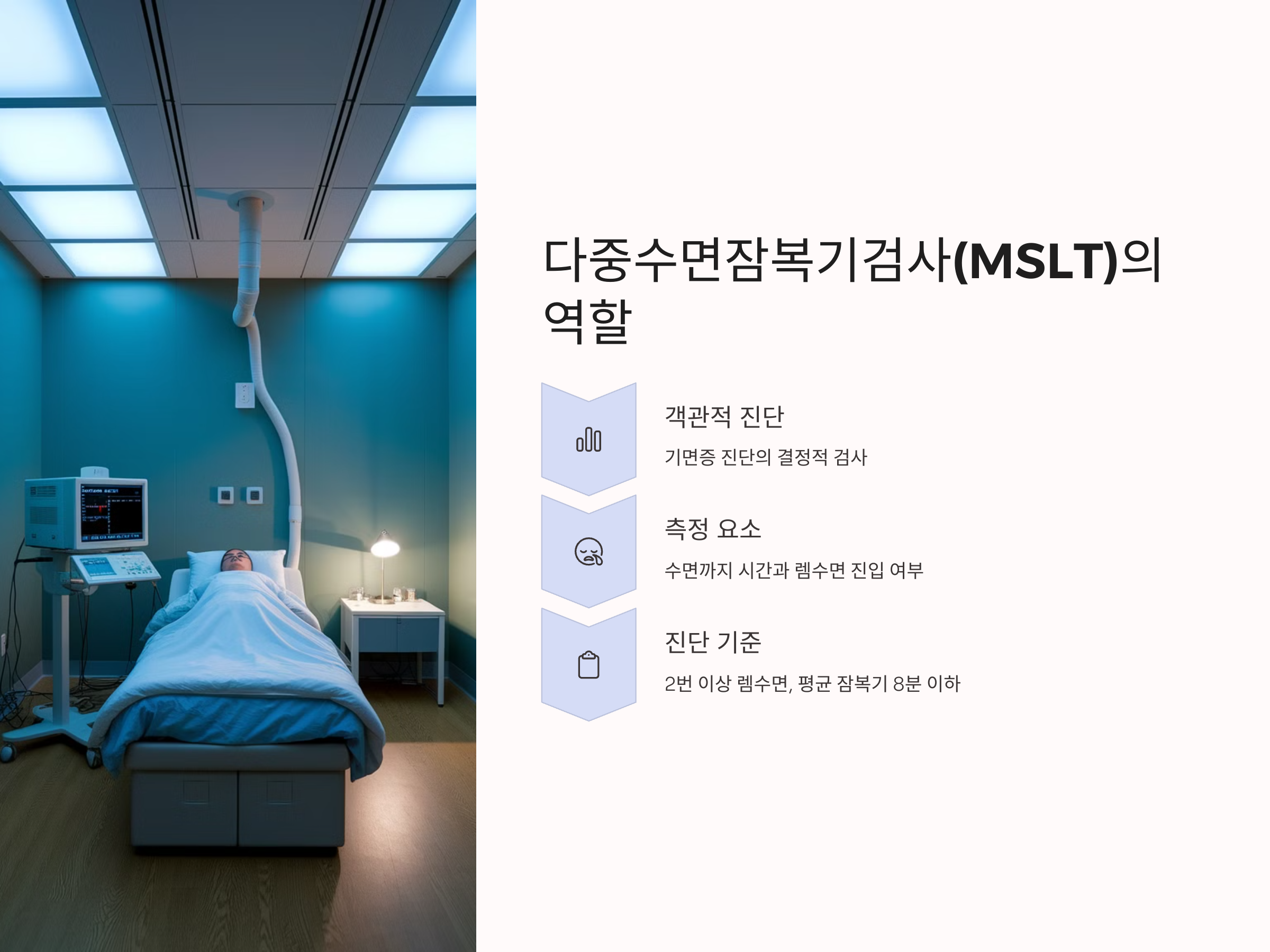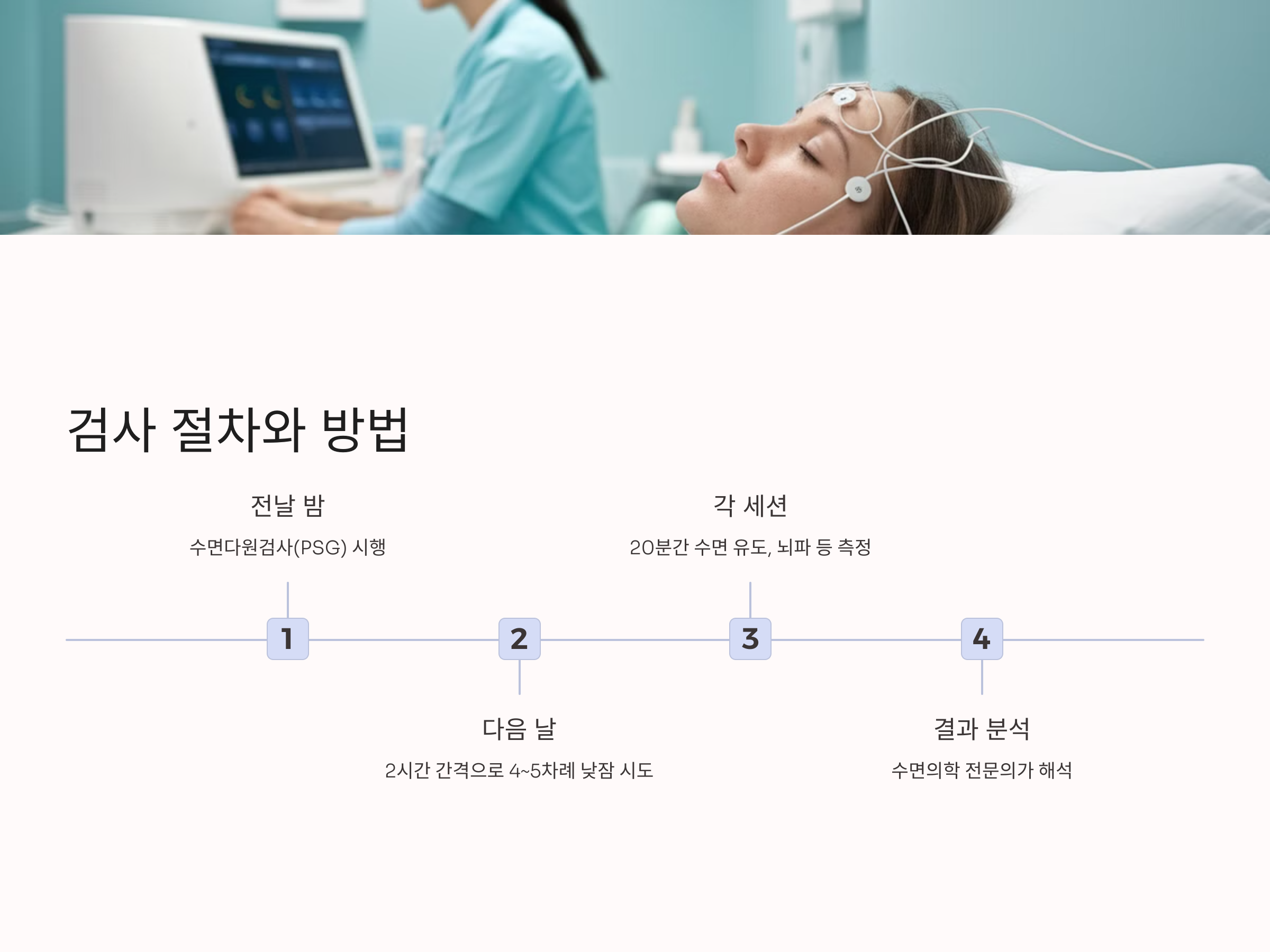- 진단 목적은 기면증, 특발성 과다수면, 수면무호흡증 후 잔존 졸림 증상 평가 등