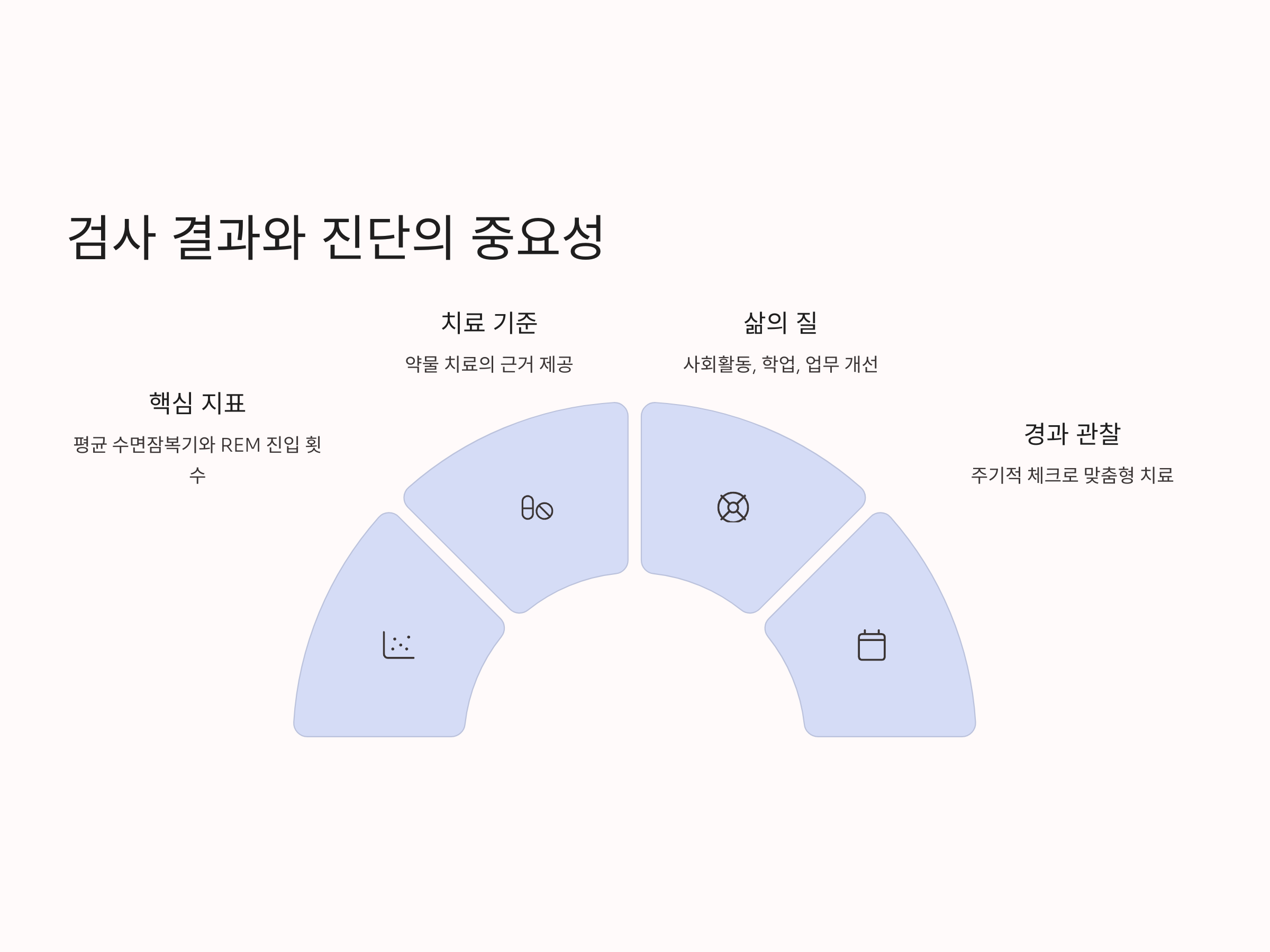 MSLT 결과는 총 4~5회 측정된 수면 시작 시간과 렘수면 여부를 기반으로 분석되며, 결과적으로 '평균 수면잠복기'와 'REM 진입 횟수'가 핵심 지표입니다. 평균 수면잠복기가 8분 이하이고, 2회 이상의 REM 진입이 확인되면 기면증으로 진단하게 됩니다. 특히 이런 진단은 약물 치료의 기준이 되며, 사회활동과 학업, 업무에 있어 매우 중요한 전환점이 됩니다.