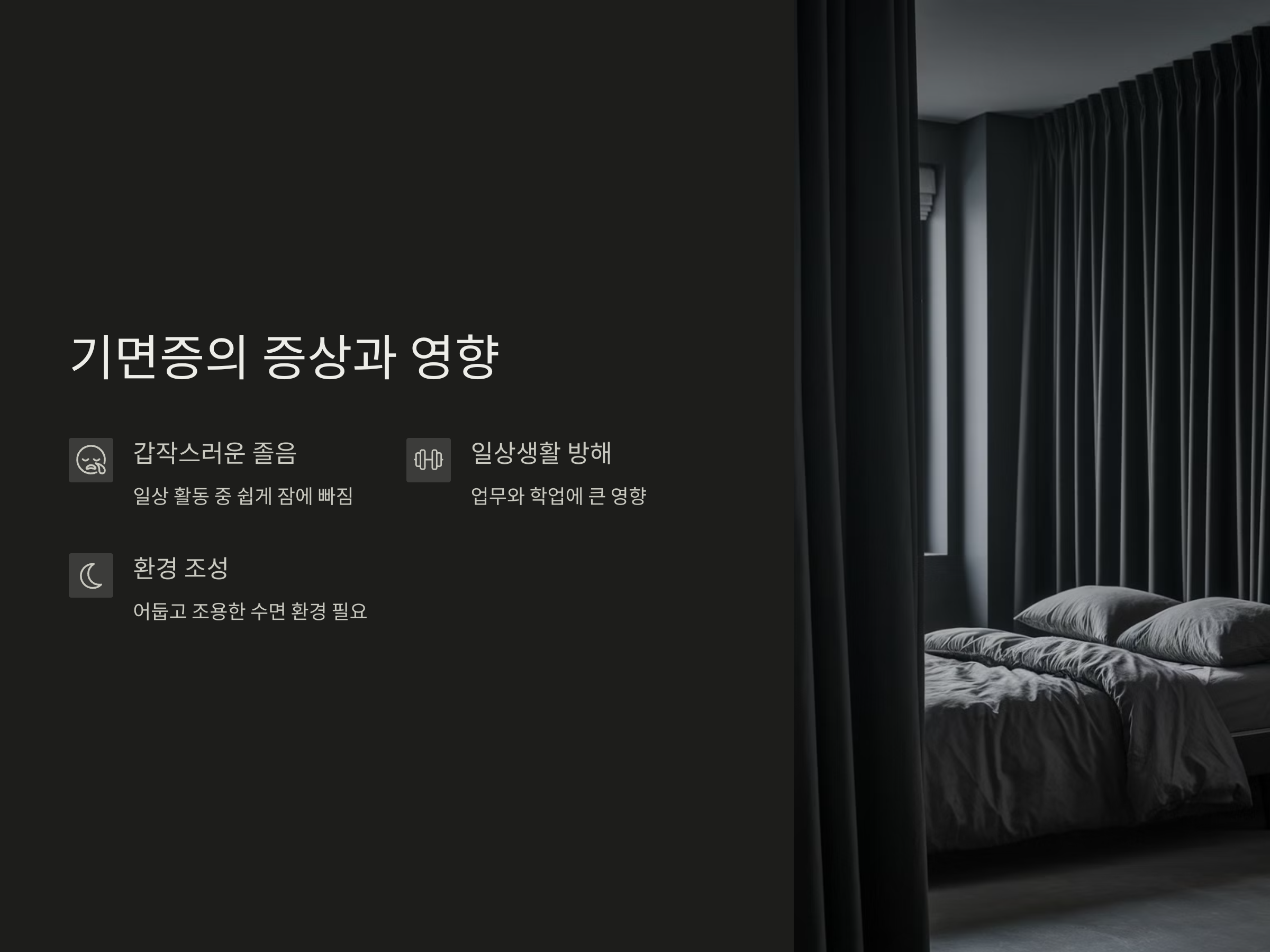 기면증은 갑자기 깊은 졸음이 오거나 일상적인 활동 중에 쉽게 잠에 빠질 수 있는 상태입니다. 환자는 낮 동안에도 졸음이 계속해서 발생하며, 이는 일상적인 업무나 학업에 큰 영향을 미칩니다. 기면증 환자는 밤에 충분한 수면을 취해도 낮 동안 지속적인 졸음 증세에 시달리기 때문에, 이를 위한 적절한 관리가 필요합니다.