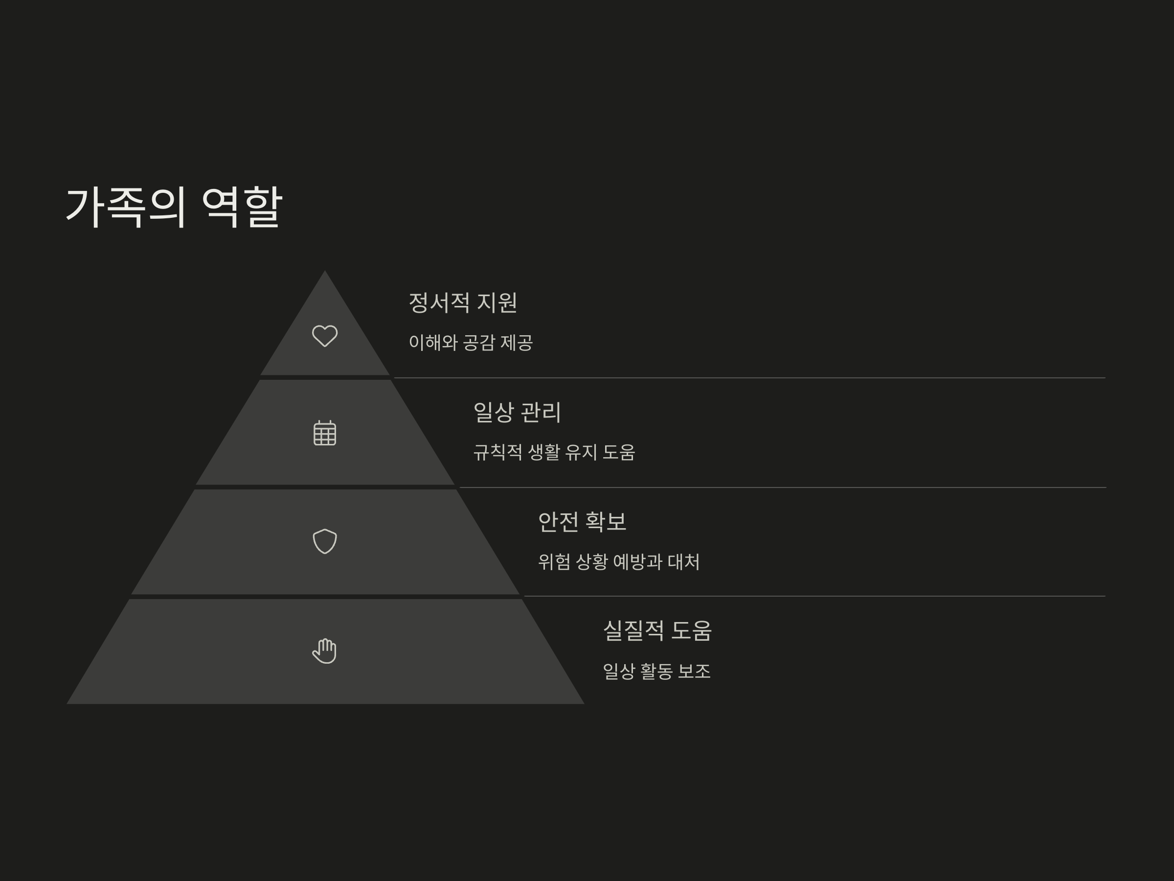 가족이 할 수 있는 일은 환자가 수면 시간을 충분히 확보할 수 있도록 지원하는 것입니다. 특히, 밤에 잠을 자는 시간이 불규칙하거나 충분하지 않다면, 환자가 일정한 시간에 자고 일어날 수 있도록 도와주어야 합니다. 예를 들어, 취침 시간을 정해 놓고 그 시간을 지키도록 유도하는 것만으로도 큰 차이를 만들 수 있습니다.