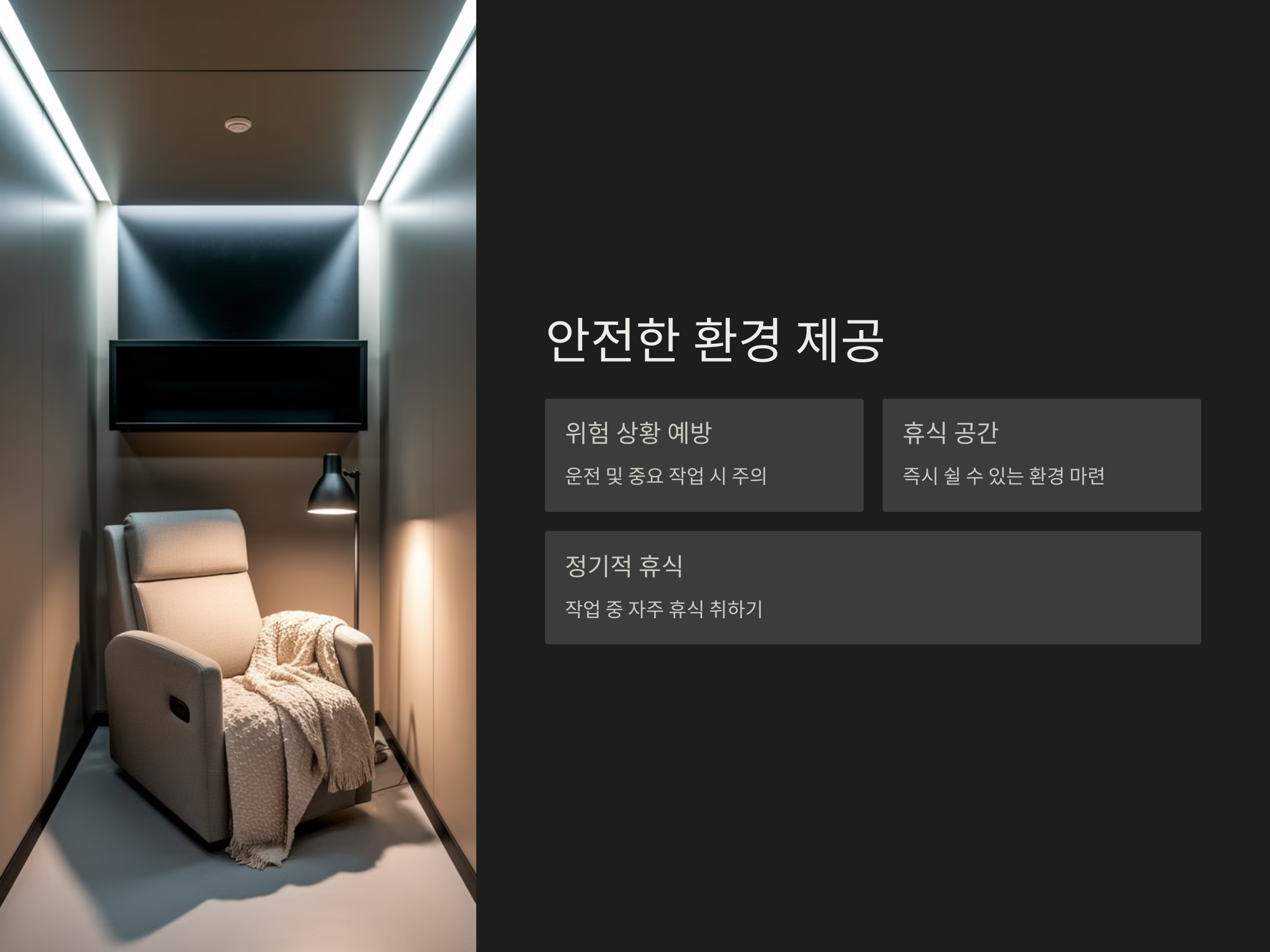 기면증 환자는 갑자기 졸음이 올 수 있기 때문에, 일상생활에서 안전을 보장하는 것이 매우 중요합니다. 가족은 환자가 잠시라도 졸릴 때, 특히 운전 중이나 중요한 작업을 할 때 적절한 대처를 할 수 있도록 도와야 합니다.