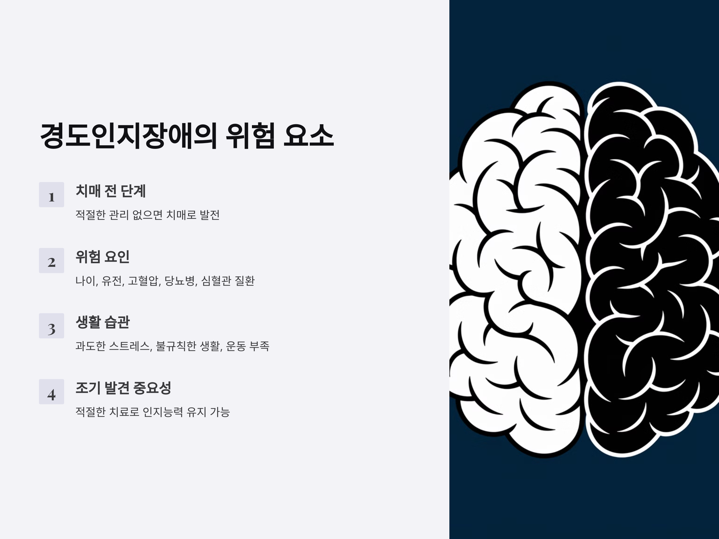 경도인지장애의 위험 요소로는 나이, 유전적 요인, 고혈압, 당뇨병, 심혈관 질환 등이 있습니다. 이러한 요인들이 복합적으로 작용하여 경도인지장애를 유발할 수 있습니다. 또한, 과도한 스트레스, 불규칙한 생활, 운동 부족 등도 인지 기능 저하에 영향을 미칠 수 있습니다.