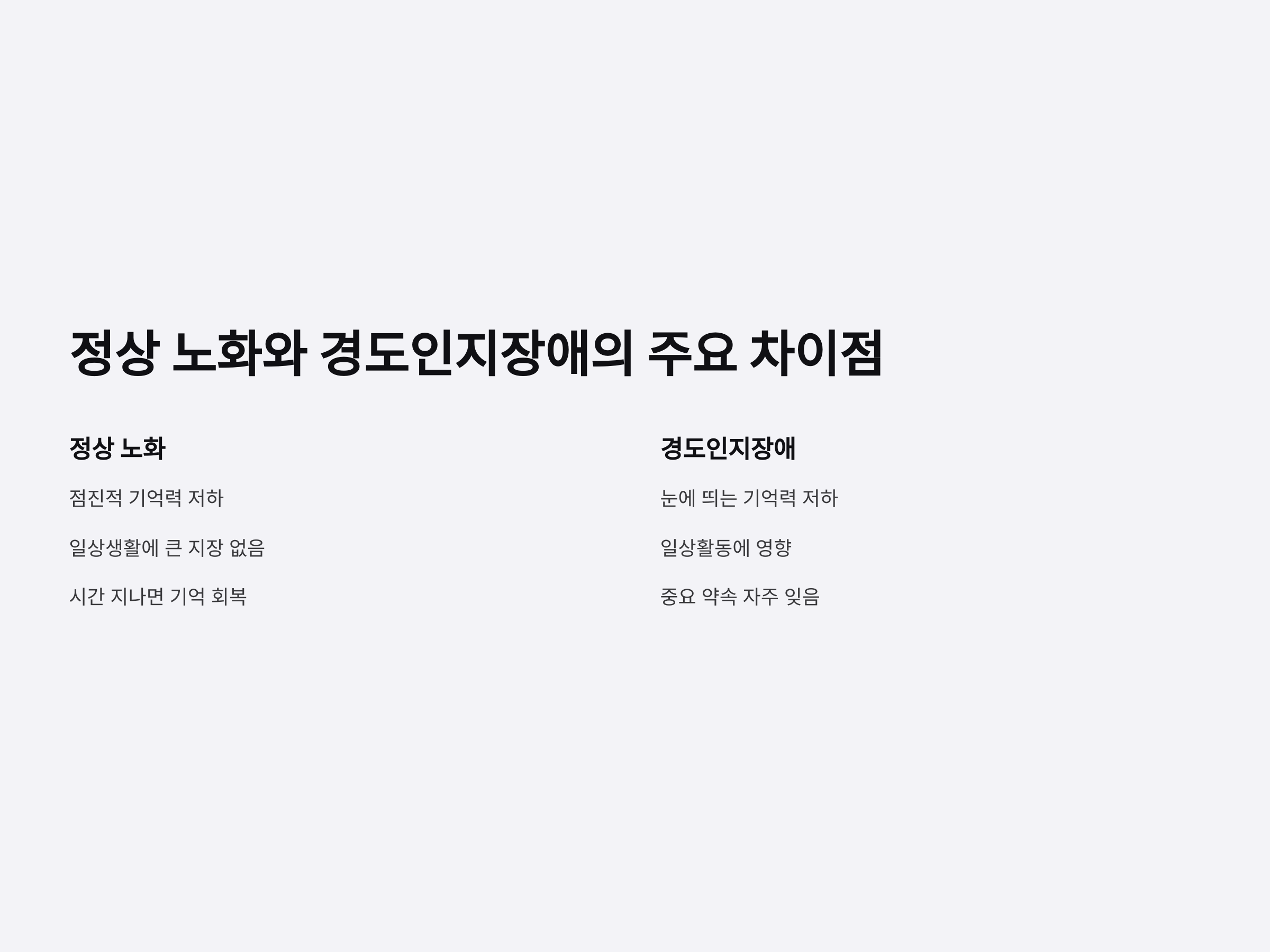 반면, 경도인지장애는 기억력 저하가 눈에 띄게 나타나고 일상적인 활동에 영향을 미칠 수 있습니다. 예를 들어, 자주 길을 잃거나, 중요한 약속을 자주 잊어버리거나, 일상적인 작업을 수행하는데 시간이 더 오래 걸리게 되는 경우가 이에 해당합니다. 경도인지장애는 아직 치매로 진단되지 않지만, 인지 능력의 저하가 일상 생활에 영향을 미칠 정도로 심각한 상태입니다.