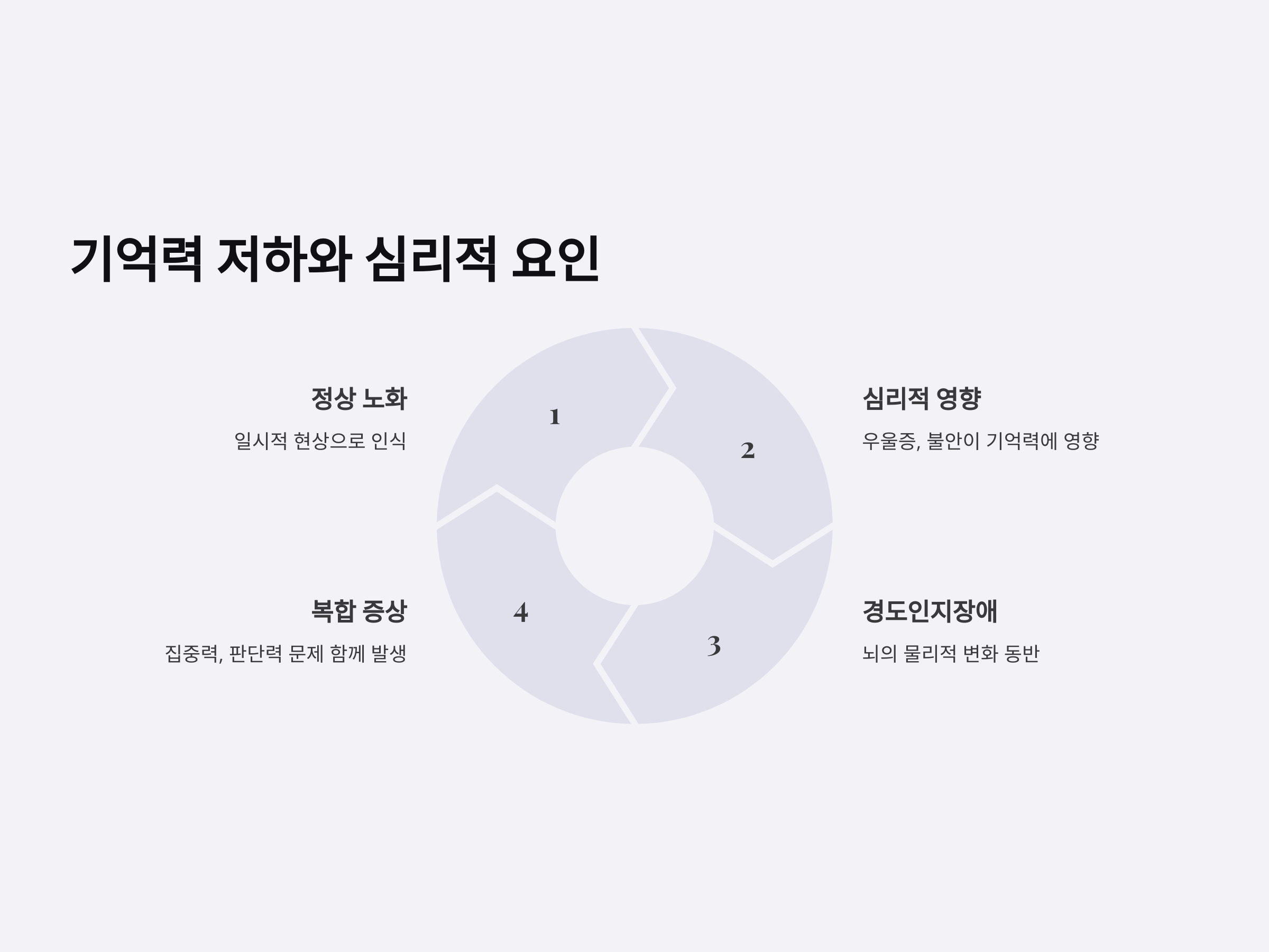 정상적인 노화 과정에서 기억력 저하가 나타날 때, 대부분의 사람들은 이를 일시적인 현상으로 받아들입니다. 이 경우, 우울증이나 불안과 같은 심리적인 요인이 기억력 저하에 영향을 미칠 수 있습니다. 예를 들어, 스트레스나 우울감이 심할 경우, 기억력에 일시적인 문제가 발생할 수 있습니다.