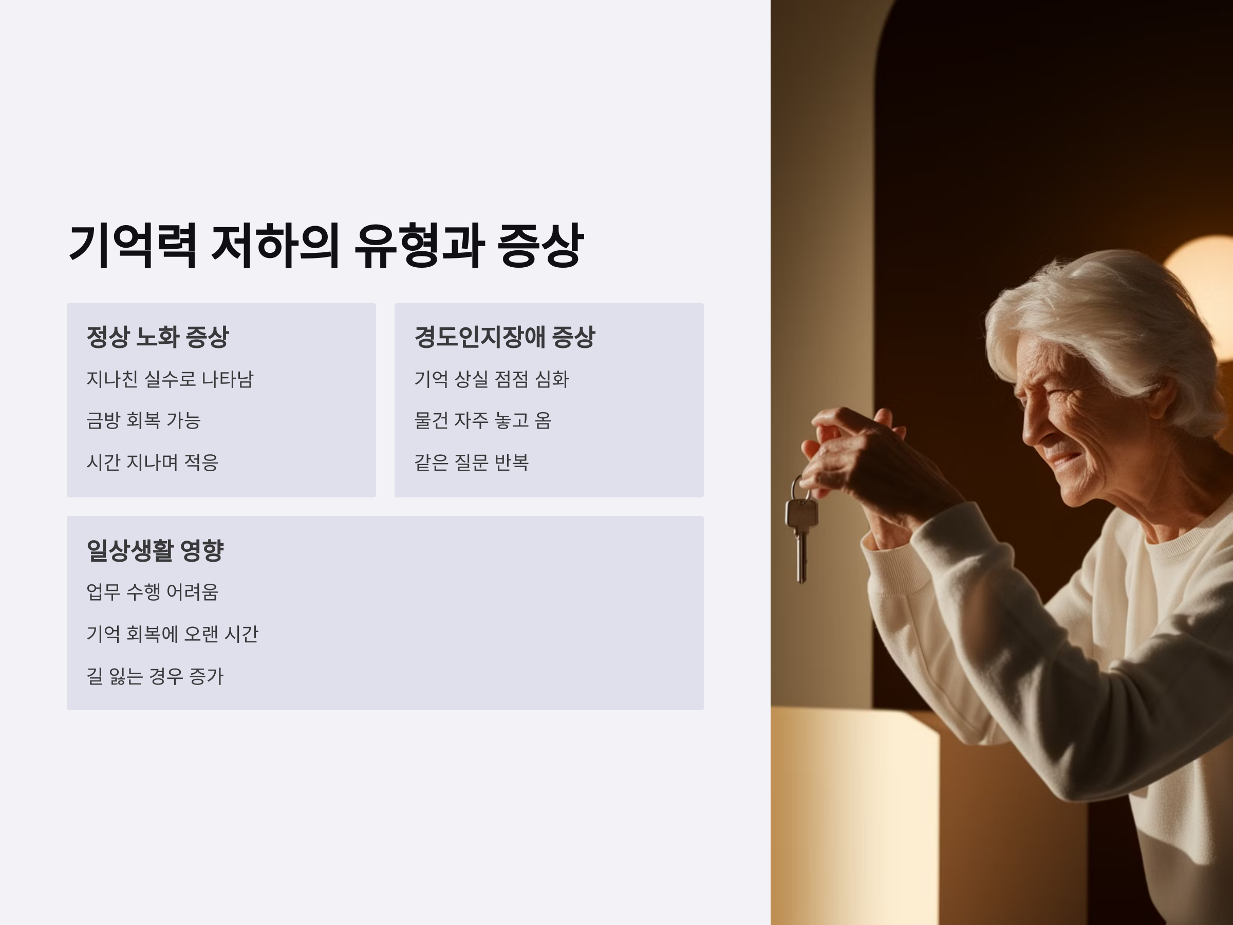 정상적인 노화에서 나타나는 기억력 저하는 대체로 '지나친 실수'로 나타납니다. 예를 들어, 일상적인 업무를 할 때 종종 실수할 수 있지만, 이를 금방 회복하거나 다시 기억할 수 있습니다. 또한, 이와 같은 실수는 시간이 지나면서 자연스럽게 적응되는 경향이 있습니다.