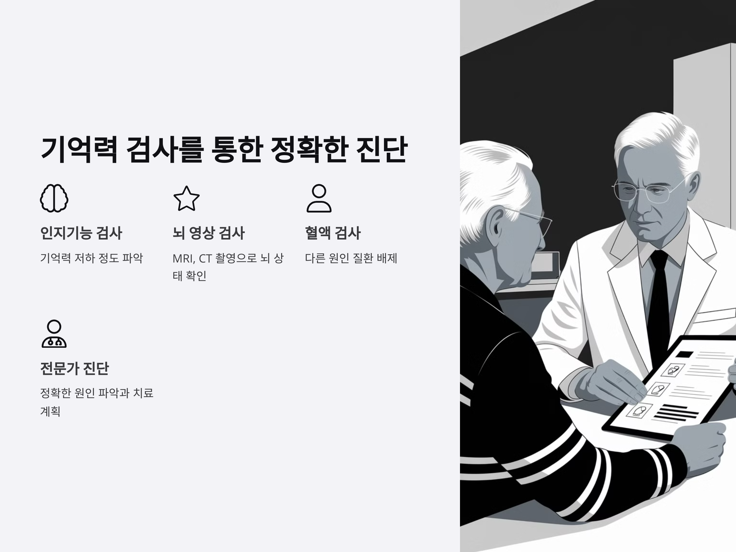 검사 방법에는 다양한 종류가 있으며, 대표적으로는 간단한 인지 기능 검사, 뇌 MRI나 CT 촬영, 혈액 검사 등이 있습니다. 이러한 검사를 통해 뇌의 상태를 파악하고, 필요한 경우 추가적인 치료나 생활 습관 개선을 권장할 수 있습니다.