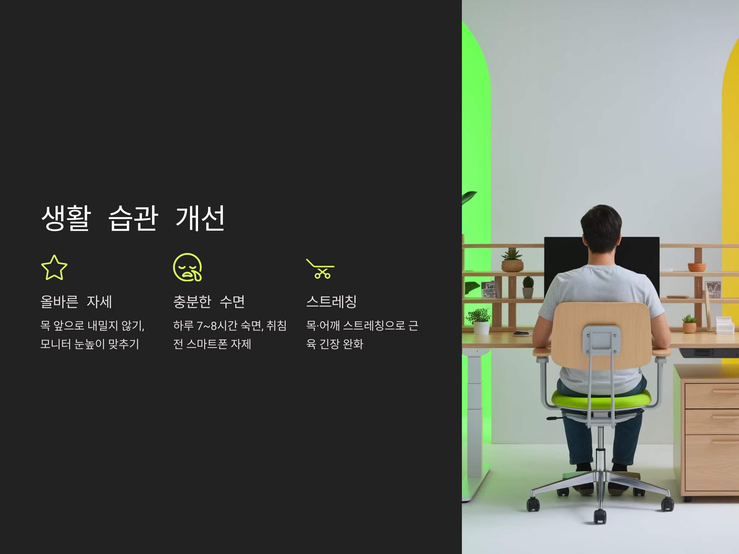 - 의자에 앉을 때 허리를 곧게 펴고, 모니터는 눈높이에 맞추는 것이 좋습니다.