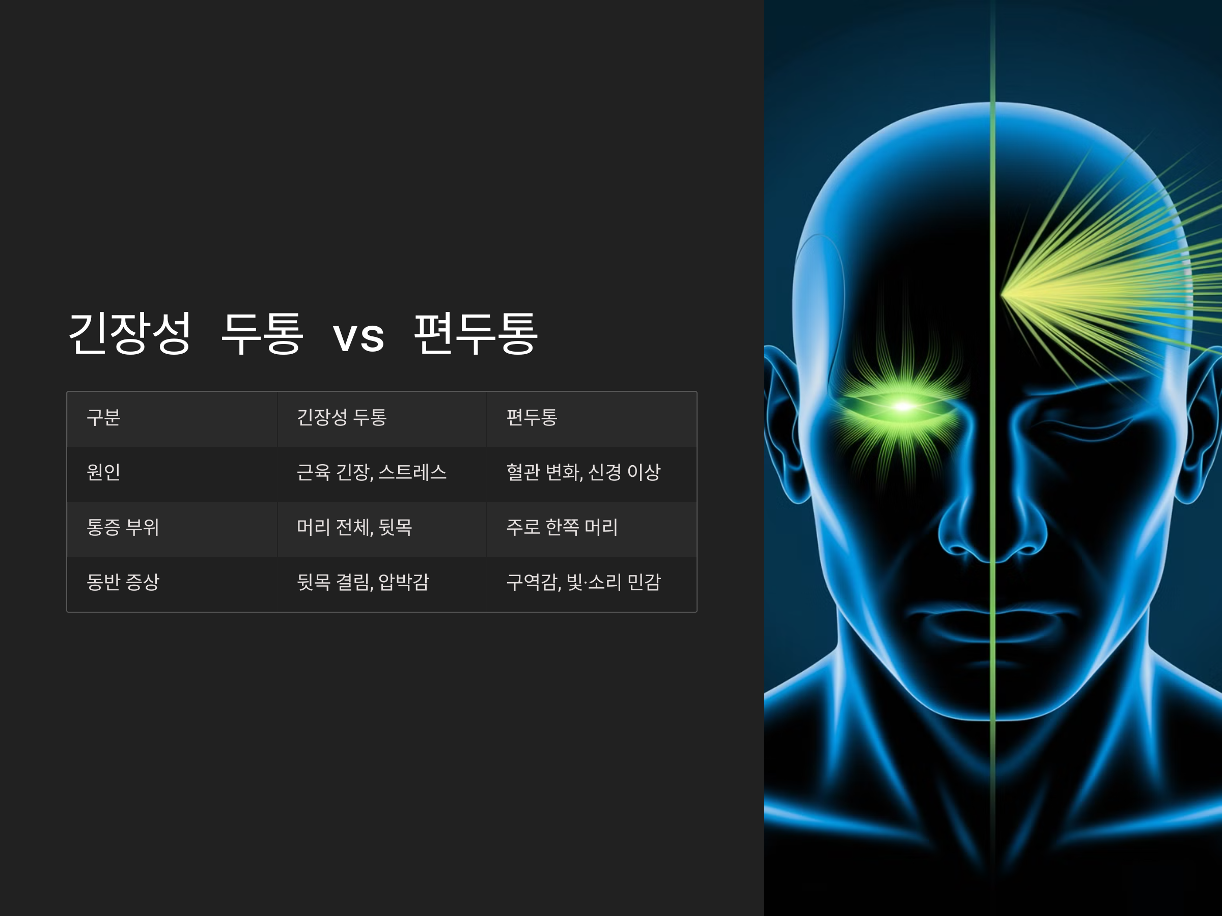 | 구분 | 긴장성 두통 | 편두통 |