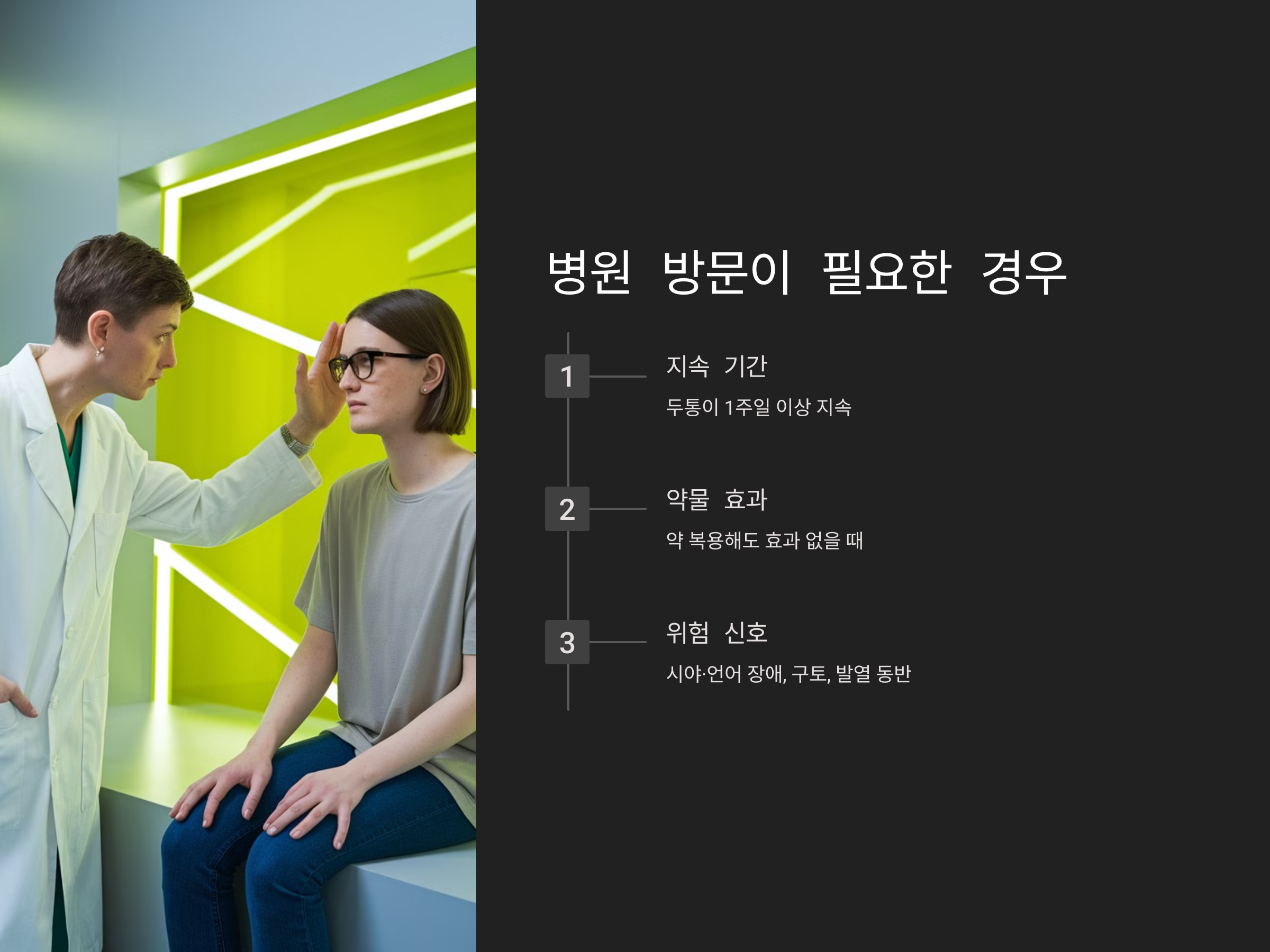 긴장성 두통은 대부분 생활 습관 개선으로 완화되지만, 다음과 같은 경우에는 병원 방문이 필요합니다.