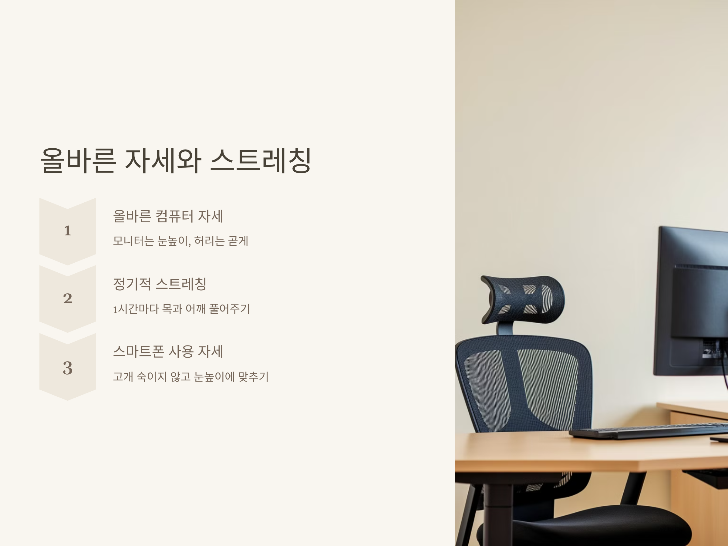 - 목을 천천히 좌우로 돌리거나, 어깨를 가볍게 풀어주는 동작이 효과적입니다.