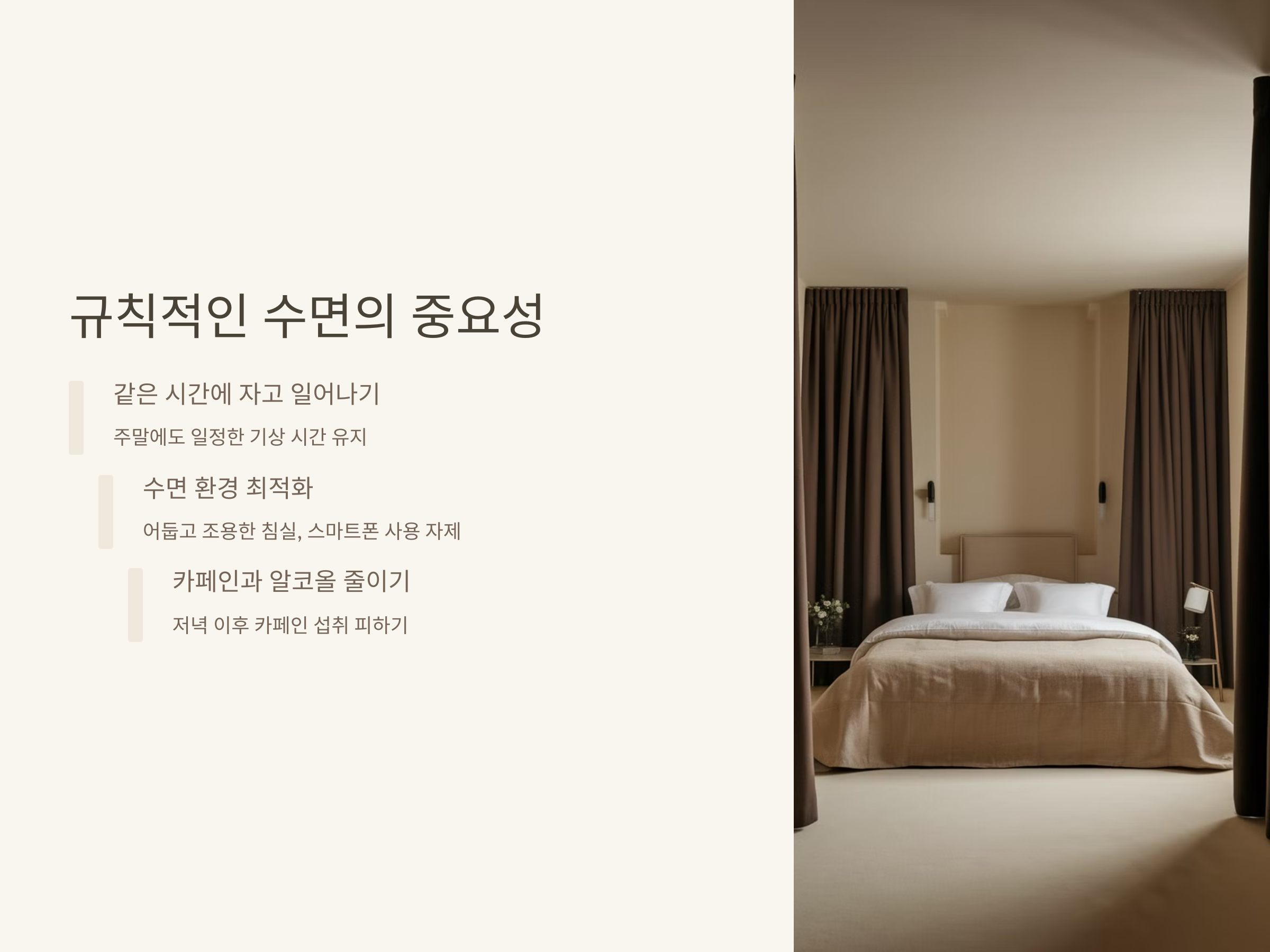 - 저녁 시간 이후에는 카페인 섭취를 피하고, 과음하지 않는 것이 좋습니다.