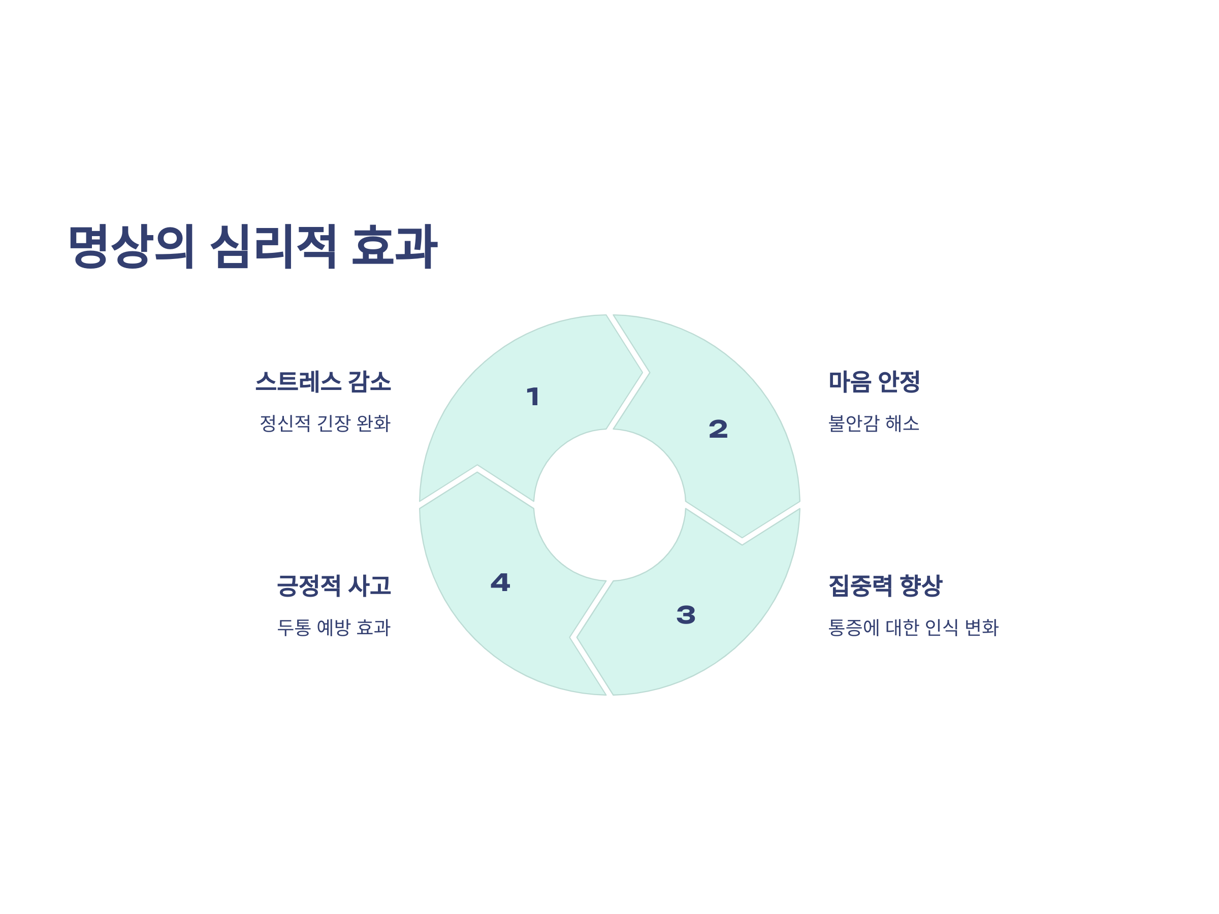 명상은 신체뿐만 아니라 마음의 긴장을 풀어주는 중요한 역할을 합니다. 긴장성 두통의 주요 원인 중 하나는 정신적 스트레스입니다. 명상은 스트레스를 감소시키고 마음을 안정시켜, 신체적인 긴장을 줄여주는 데 효과적입니다. 특히 '호흡 명상'은 두통을 완화하는 데 매우 유용합니다.