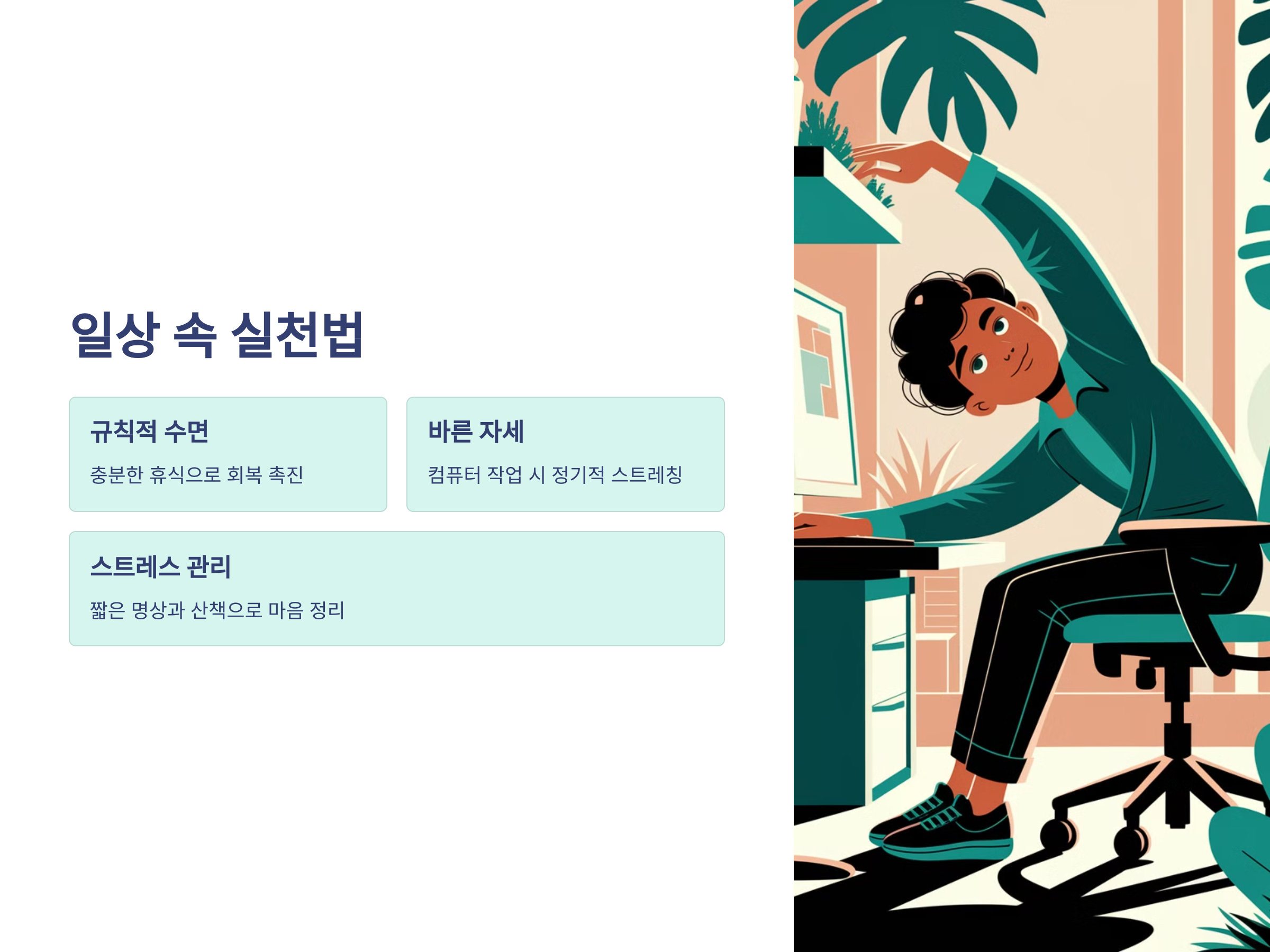 규칙적인 운동은 근육의 긴장을 풀어주는 데 도움이 됩니다. 또한, 바른 자세를 유지하는 것도 긴장성 두통을 예방하는 데 중요합니다. 컴퓨터 작업 시 올바른 자세를 유지하고, 자주 휴식을 취하는 것이 좋습니다.