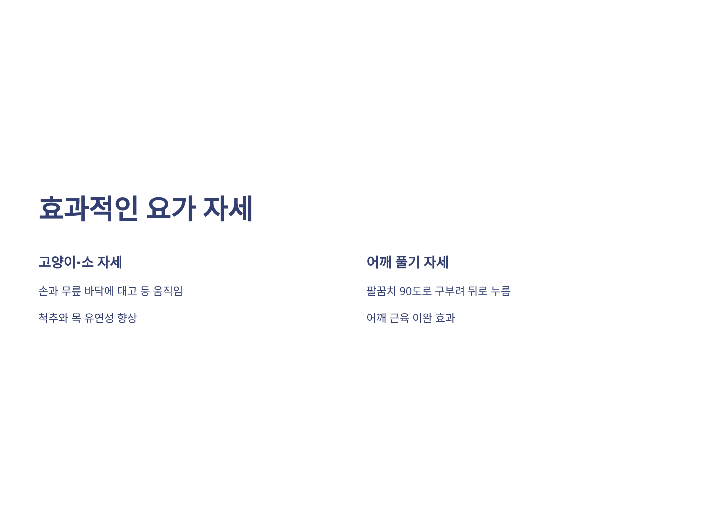 이 자세는 손과 무릎을 바닥에 대고 시작하며, 호흡에 맞춰 등을 둥글게 만들고, 다음엔 등을 아치형으로 펼칩니다. 이 과정을 반복하면서 등과 목을 유연하게 풀어줍니다.