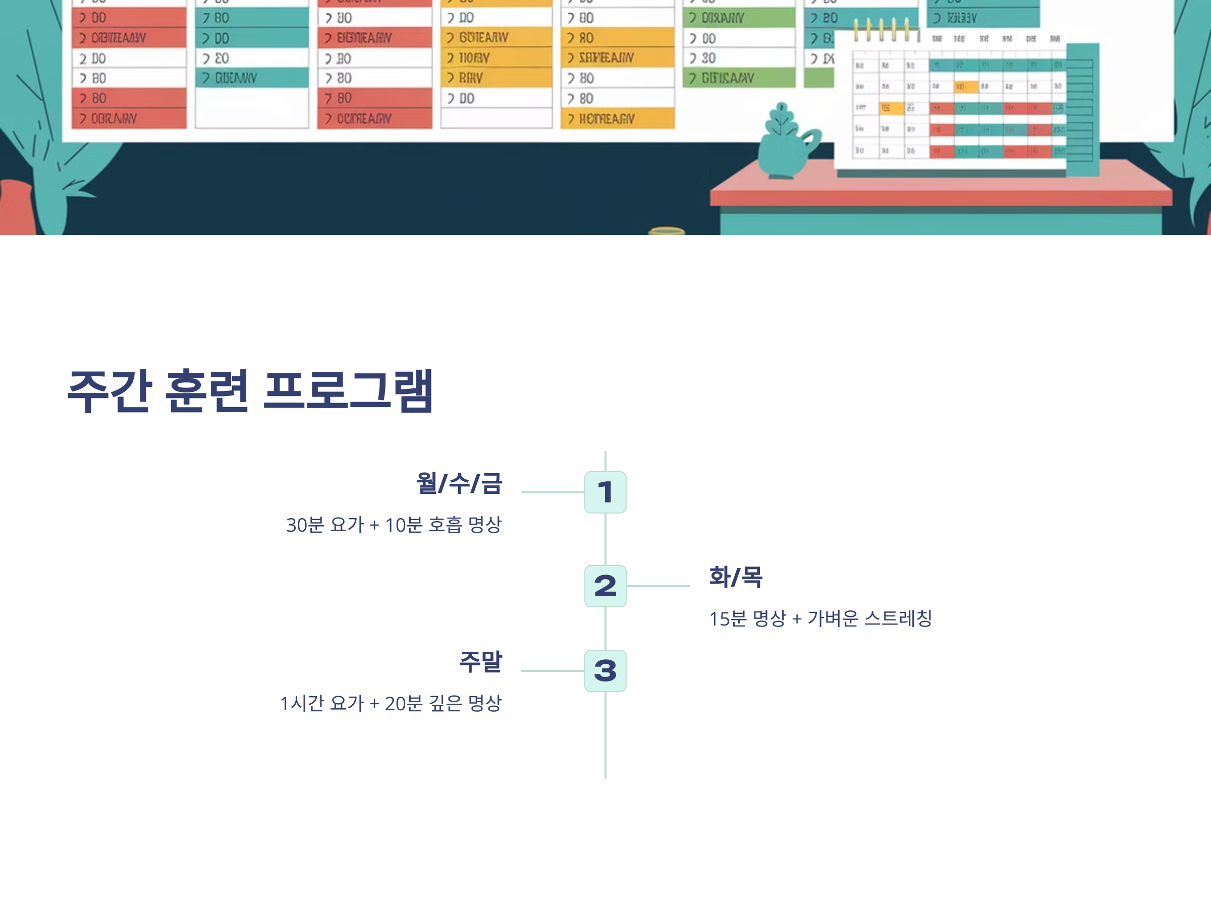 - 주말: 1시간 요가 세션 + 20분 깊은 호흡 명상