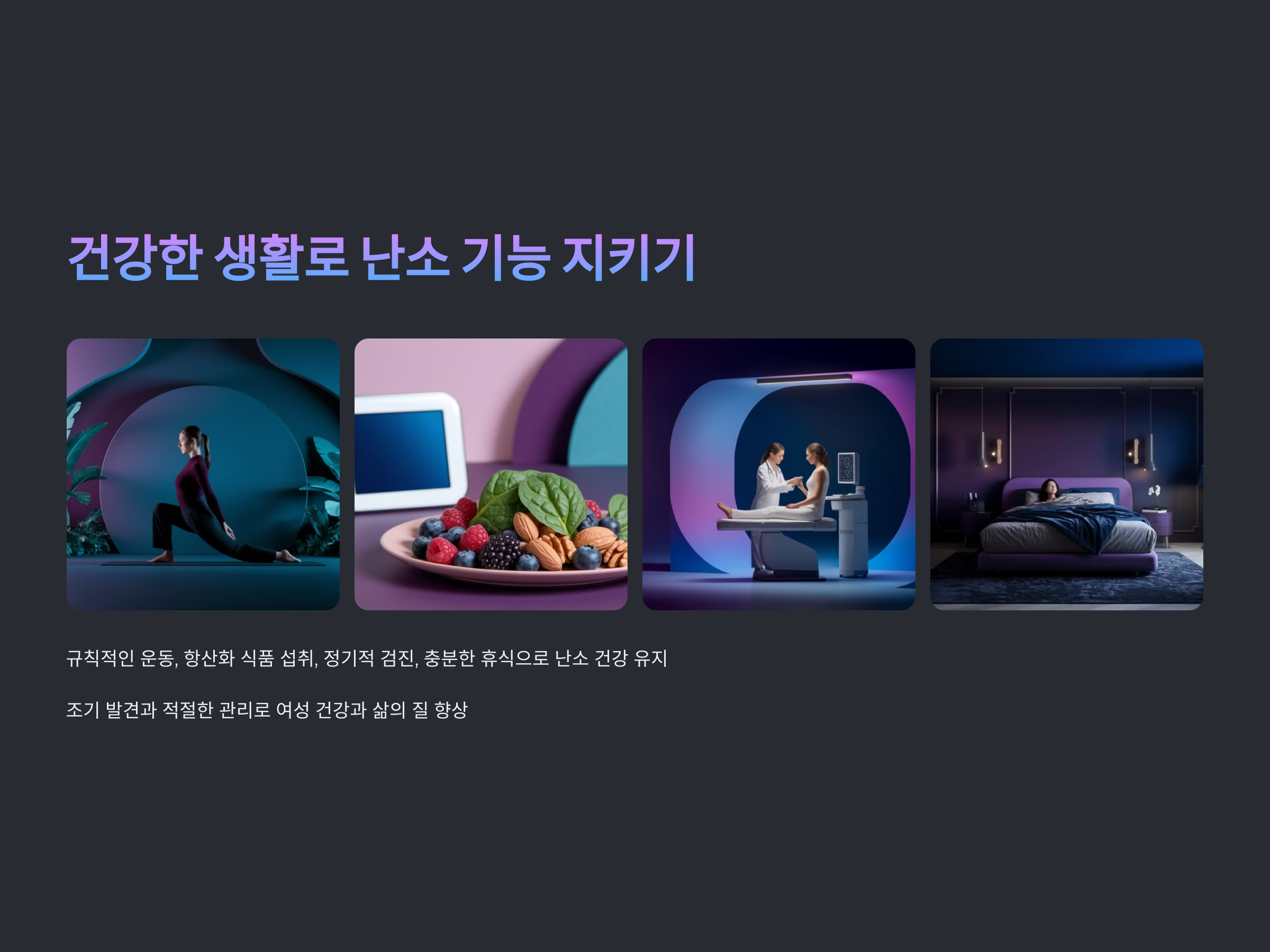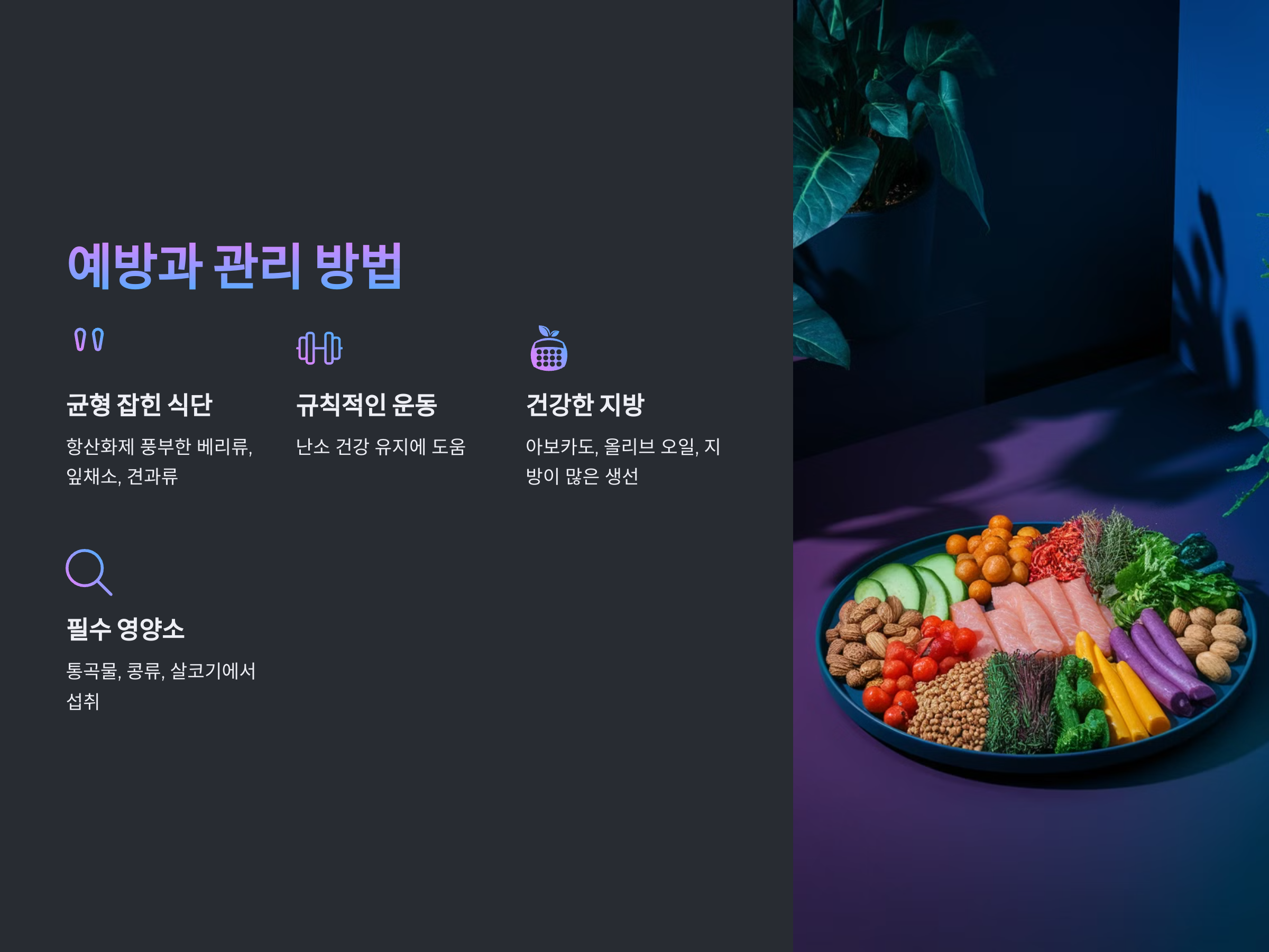 난소 기능 저하를 예방하고 관리하기 위해서는 건강한 생활습관이 필수적입니다. 균형 잡힌 식단과 규칙적인 운동은 난소 건강을 유지하는 데 도움이 됩니다. 특히, 항산화제가 풍부한 식품, 예를 들어 베리류, 잎채소, 견과류는 난소 세포를 손상으로부터 보호할 수 있습니다. 아보카도, 올리브 오일, 지방이 많은 생선에서 얻은 건강한 지방은 호르몬 생성을 지원합니다. 또한, 비타민과 미네랄이 풍부한 음식, 예를 들어 통곡물, 콩류, 살코기는 전반적인 생식 건강에 필요한 필수 영양소를 제공합니다. 다양한 영양이 풍부한 음식을 식단에 포함시키는 것은 최적의 난소 기능을 촉진할 수 있습니다.