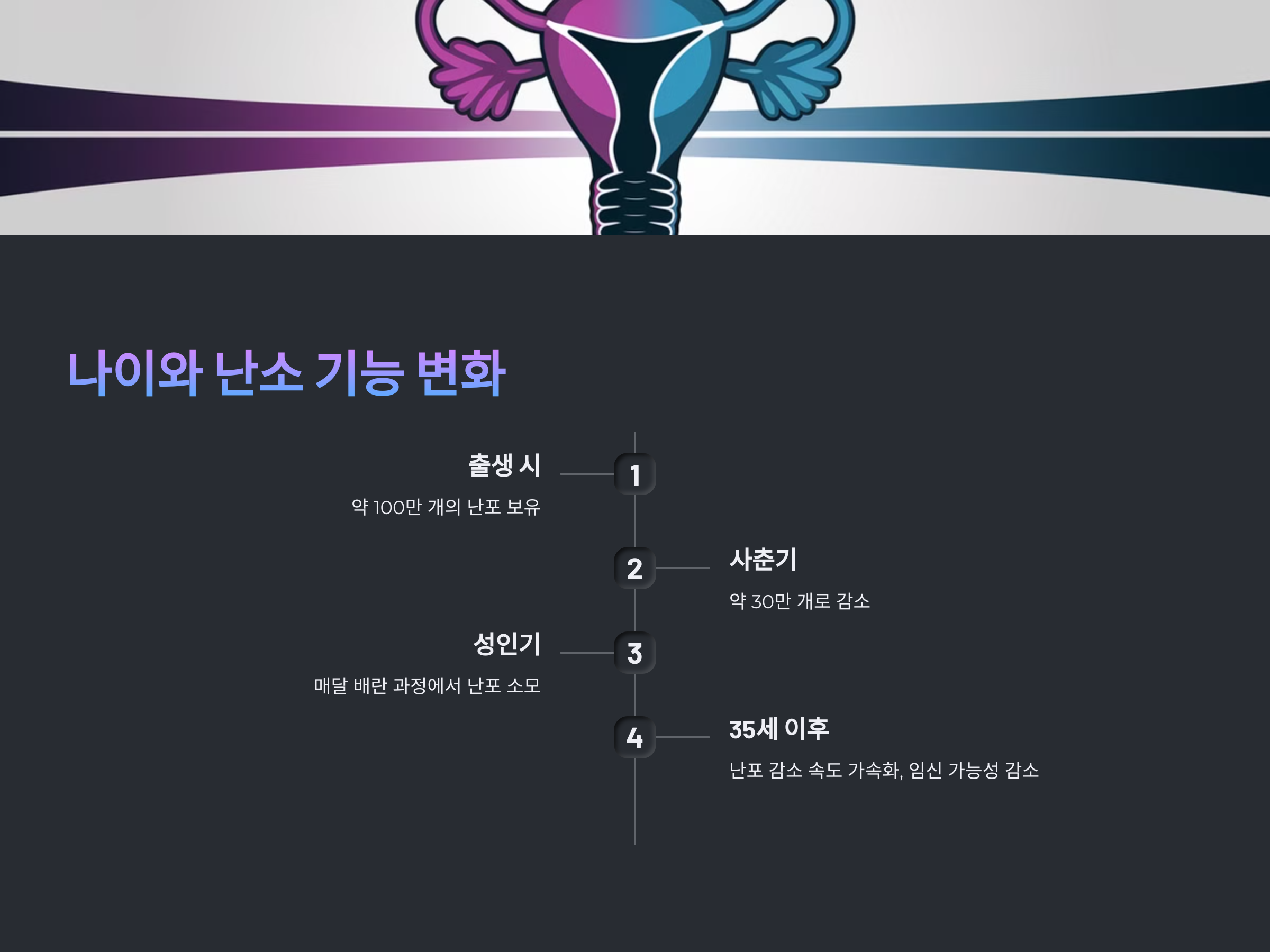 나이가 들수록 난소의 난포 수는 자연스럽게 감소합니다. 여성은 태어날 때 약 100만 개의 난포를 가지고 있지만, 사춘기에는 약 30만 개로 줄어들고, 이후 매달 배란 과정에서 난포가 소모됩니다. 특히, 35세 이후부터는 난포의 감소 속도가 빨라져 난소 기능 저하가 두드러지게 나타납니다. 이는 자연 임신의 가능성을 감소시키는 주요 요인 중 하나입니다.
