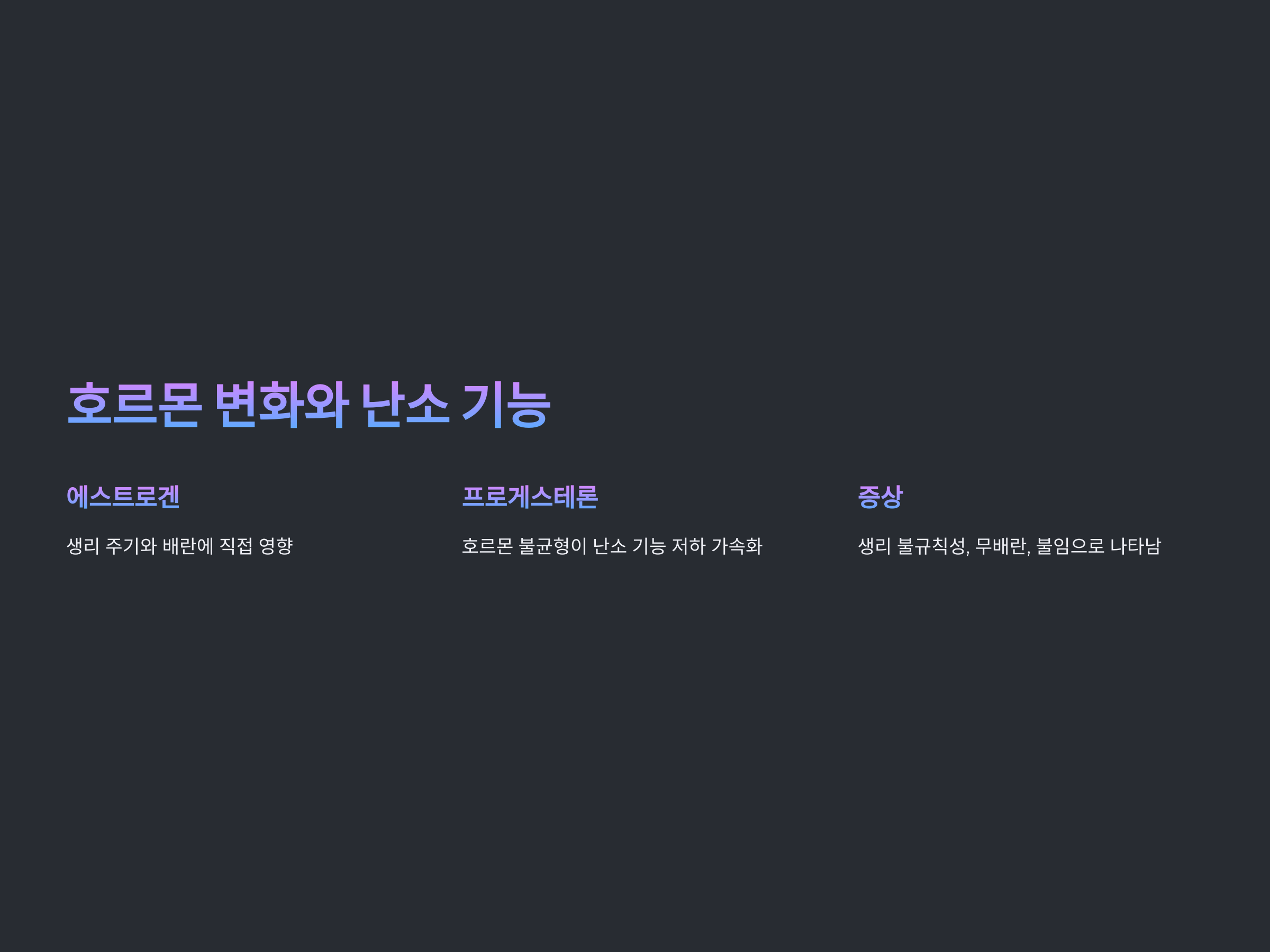 호르몬은 난소 기능에 직접적인 영향을 미칩니다. 특히, 에스트로겐과 프로게스테론 수치의 변화는 생리 주기와 배란에 영향을 줍니다. 호르몬 불균형은 난소 기능 저하를 가속화할 수 있으며, 이는 생리 주기의 불규칙성, 무배란, 불임 등의 증상으로 나타날 수 있습니다. 이러한 변화를 조기에 감지하고 관리하는 것이 중요합니다.