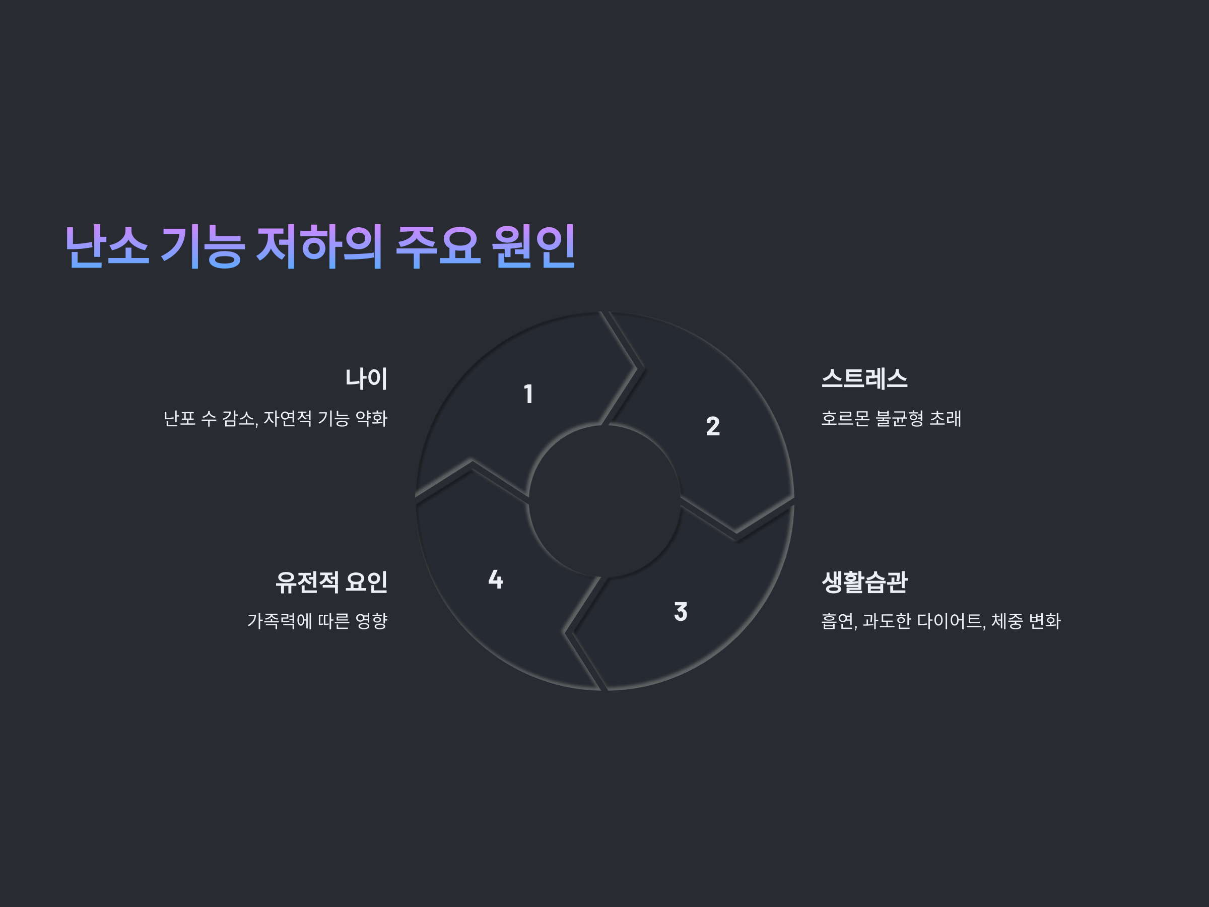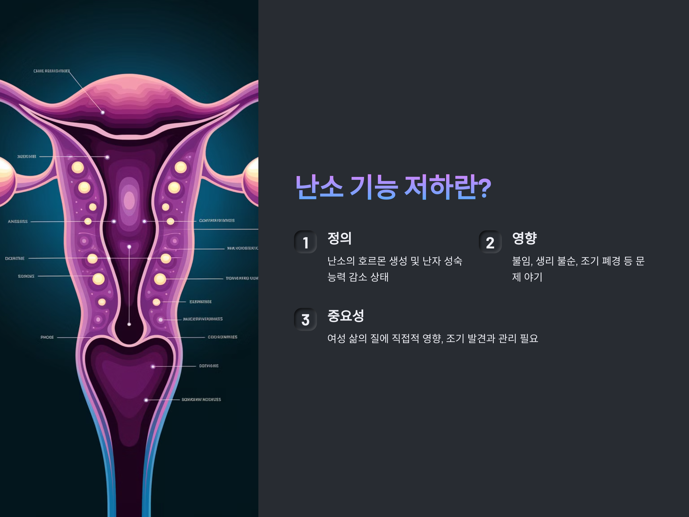난소 기능 저하란 난소가 정상적인 호르몬을 생성하거나 난자를 성숙시키는 능력이 감소한 상태를 의미합니다. 이는 불임, 생리 불순, 조기 폐경 등의 문제를 야기할 수 있습니다. 이러한 변화는 여성의 삶의 질에 직접적인 영향을 미치며, 조기에 발견하고 관리하는 것이 중요합니다.