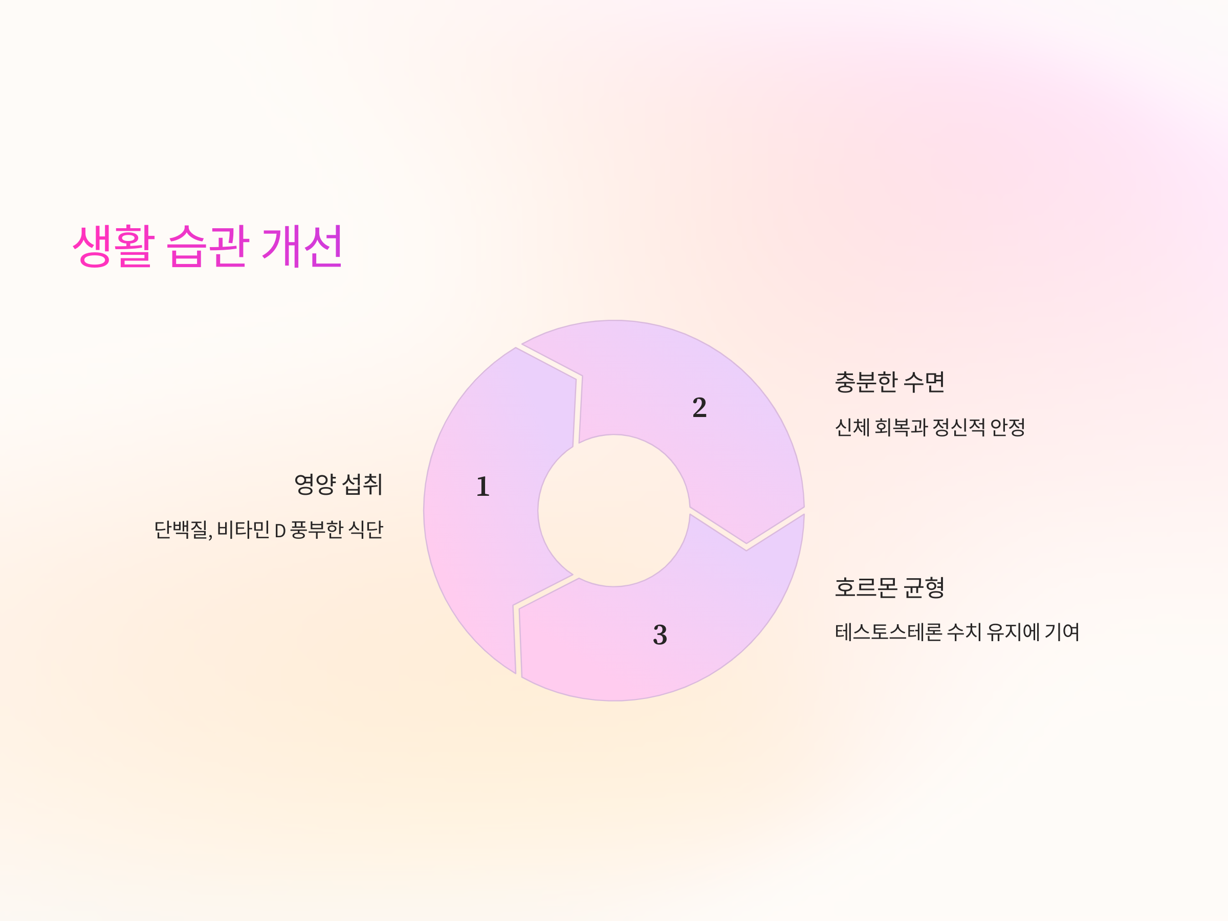건강한 식습관과 충분한 수면은 테스토스테론 수치 유지와 갱년기 증상 완화에 중요한 역할을 합니다. 단백질과 비타민 D가 풍부한 식단은 호르몬 균형을 유지하는 데 도움이 되며, 충분한 수면은 신체 회복과 정신적 안정을 제공합니다. 이러한 생활 습관의 개선은 테스토스테론 보충 요법과 운동의 효과를 더욱 높여줍니다. citeturn0search10