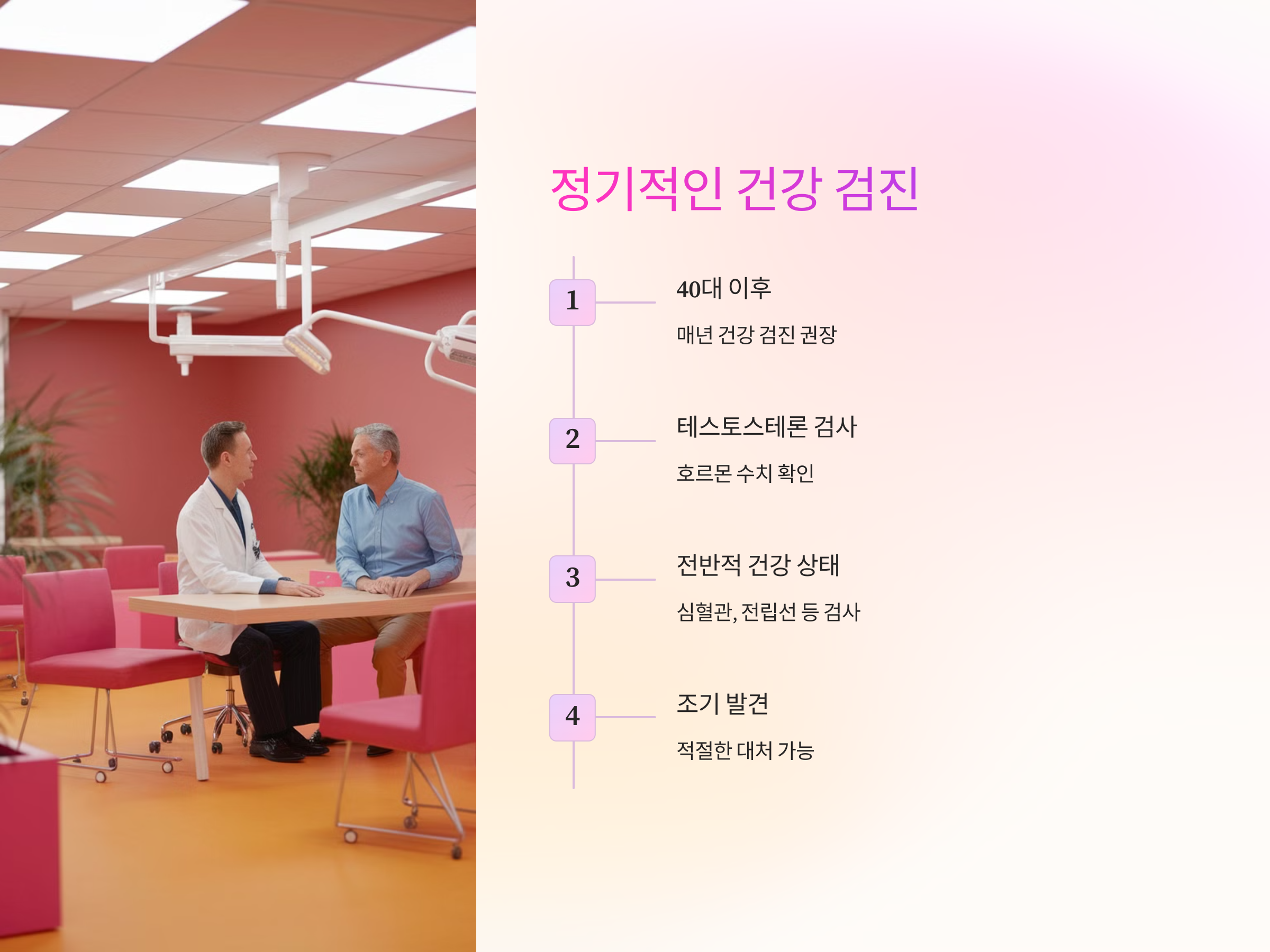 정기적인 건강 검진은 테스토스테론 수치와 전반적인 건강 상태를 확인하는 데 필수적입니다. 이를 통해 갱년기 증상을 조기에 발견하고 적절한 대처를 할 수 있습니다. 특히 40대 이후에는 매년 건강 검진을 받는 것이 권장됩니다. citeturn0search5
