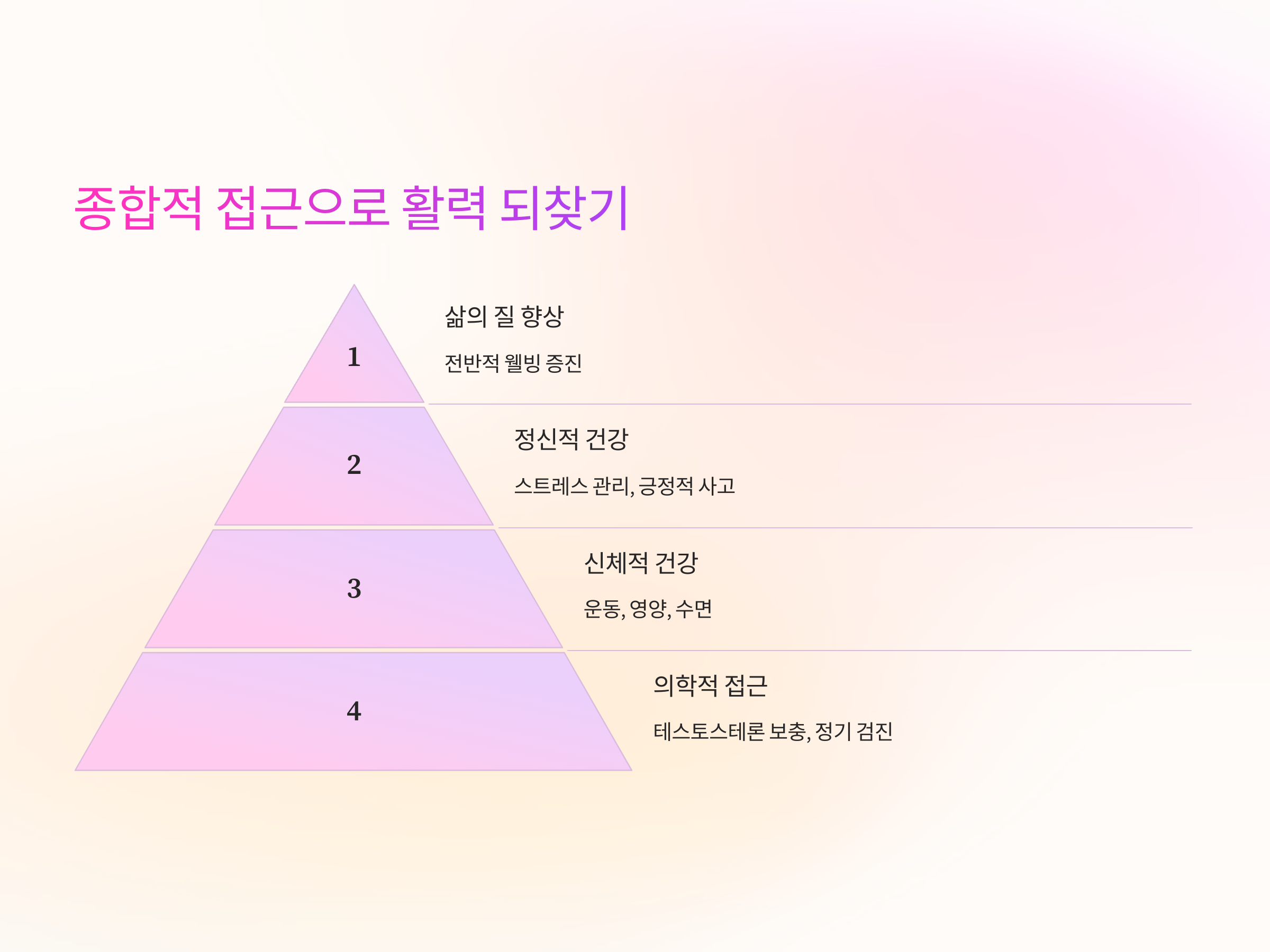 테스토스테론 보충 요법 자세히 알아보기 남성 갱년기 증상 및 치료법 확인하기 규칙적인 운동의 중요성 알아보기 스트레스 관리 방법 확인하기 정기적인 건강 검진의 필요성 알아보기