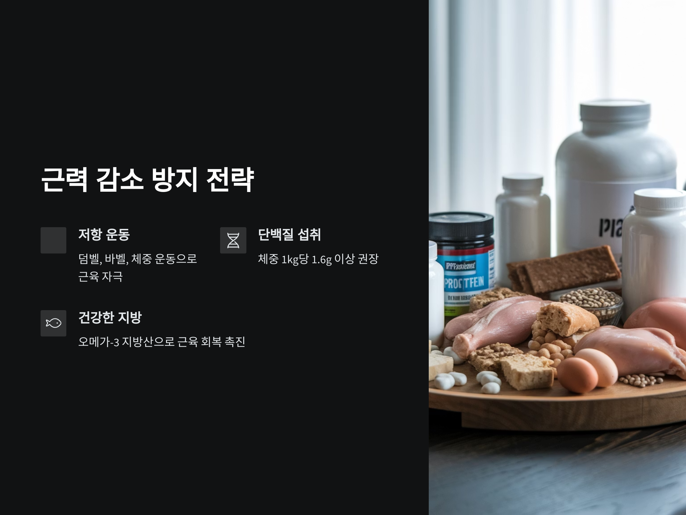 근력 감소를 막기 위한 핵심은 근력 운동입니다. 근육을 유지하려면 꾸준한 저항 운동이 필수입니다. 덤벨, 바벨, 체중 운동 등 다양한 저항 훈련을 통해 근육을 자극하고, 테스토스테론 분비를 촉진할 수 있습니다. 또한, 근육량을 유지하기 위해서는 운동 후 충분한 단백질 섭취가 중요합니다.