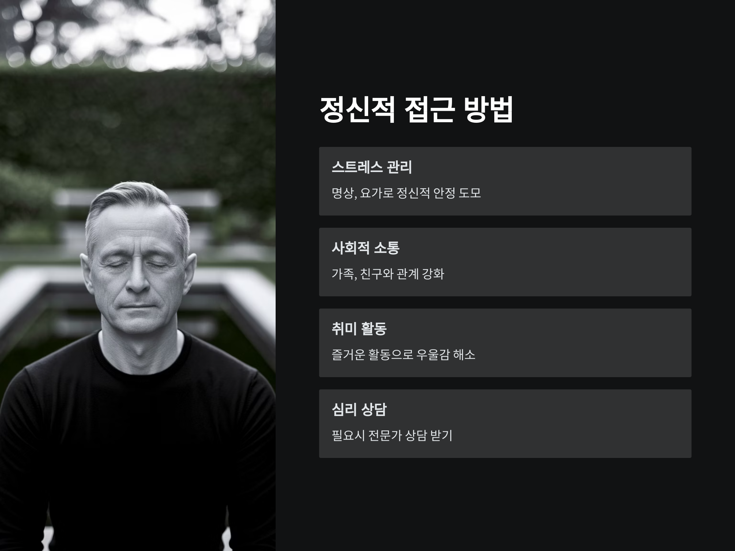 스트레스 관리와 정신적인 안정은 남성 갱년기 증후군을 관리하는 데 중요한 요소입니다. 명상, 요가, 심리 상담 등을 통해 정신적인 건강을 관리하는 것이 좋습니다. 또한, 가족이나 친구들과의 소통을 강화하고, 취미 생활을 통해 즐거운 활동을 유지하는 것이 정신적인 안정을 도울 수 있습니다.