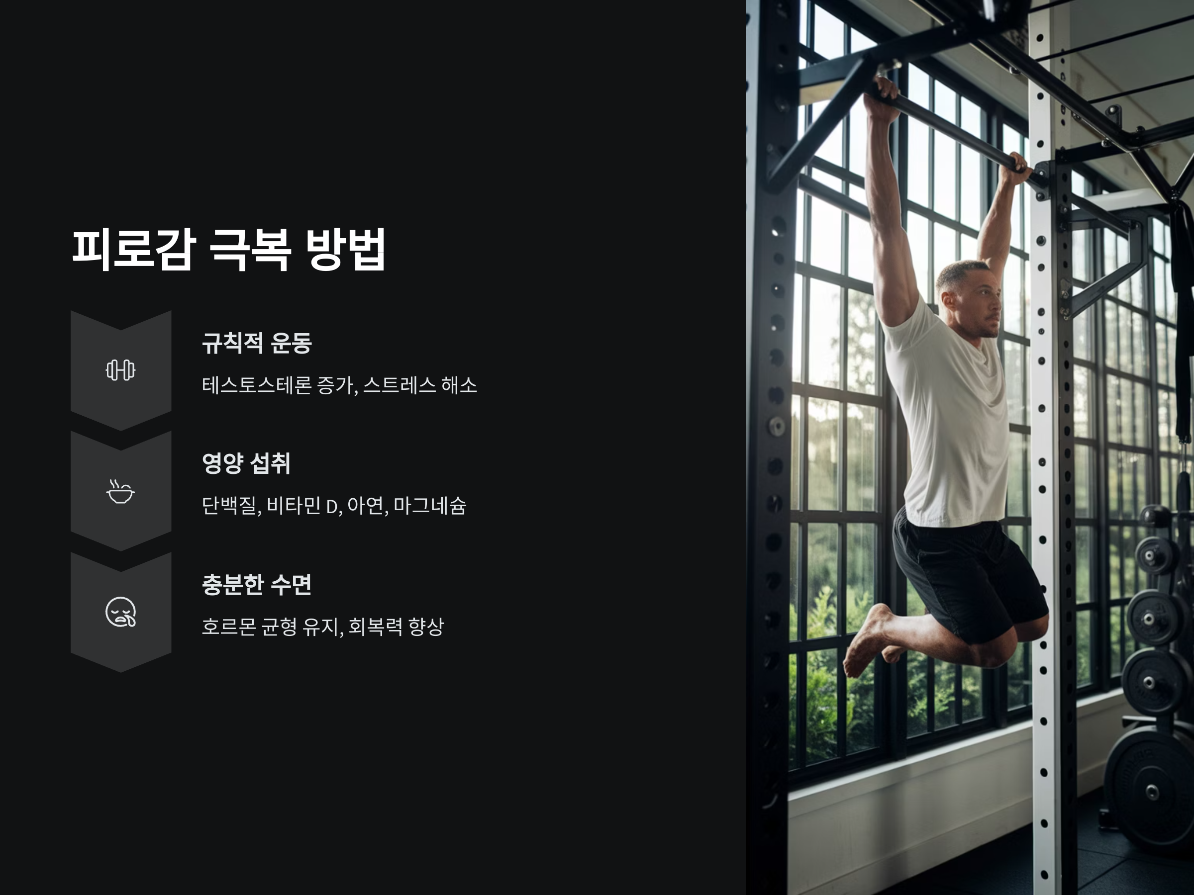 피로감을 극복하기 위한 가장 중요한 방법은 규칙적인 운동입니다. 운동은 테스토스테론 수치를 자연스럽게 증가시키고, 근육량을 유지하는 데 도움을 줍니다. 또한 운동은 스트레스 해소에도 효과적이며, 우울감을 줄이는 데도 유익합니다. 특히 근력 운동과 유산소 운동을 병행하는 것이 좋습니다.