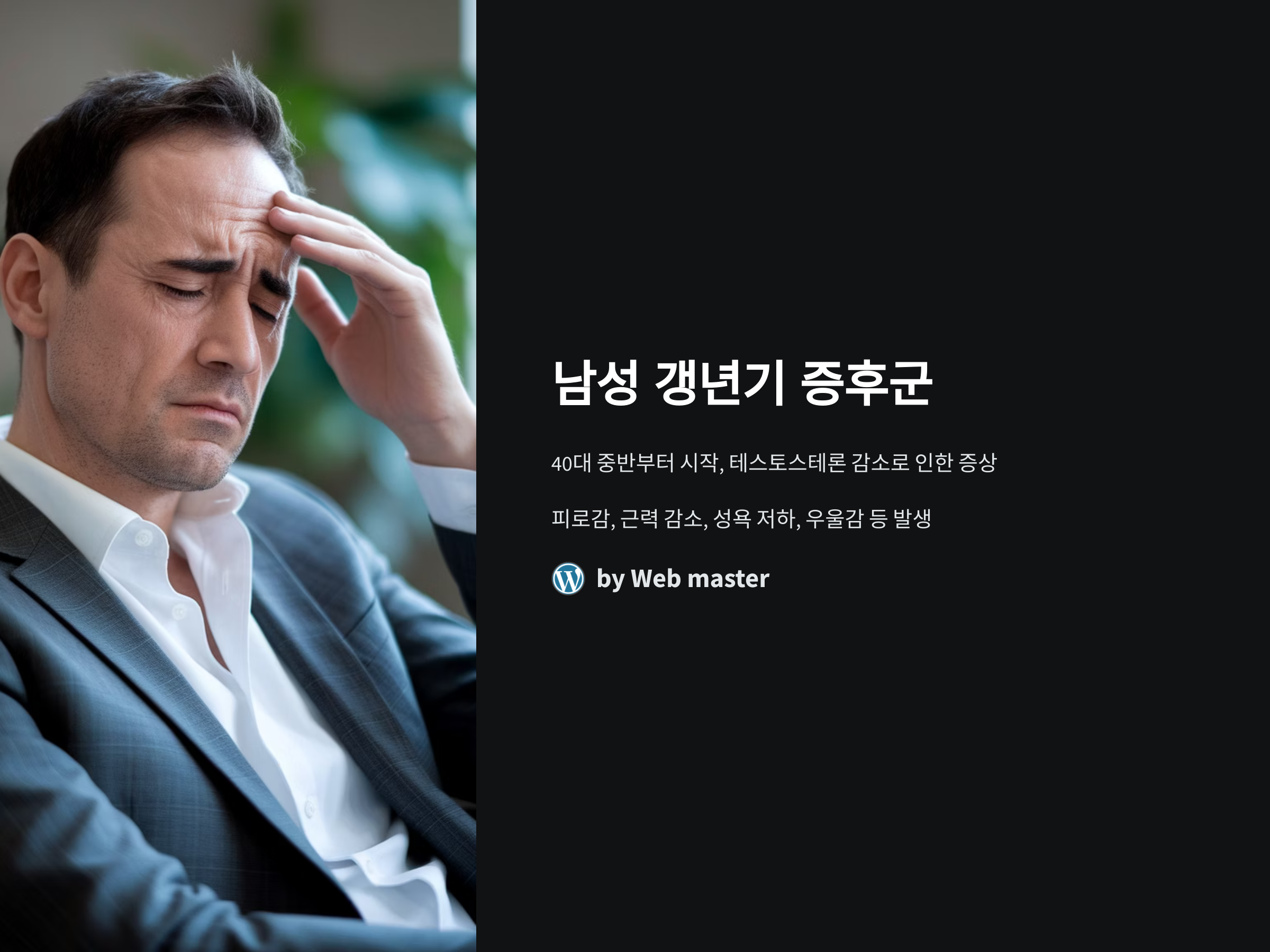 남성 갱년기 증후군을 제대로 이해하고, 이를 관리할 방법을 찾아보는 것이 중요합니다. 갱년기 증후군은 호르몬 변화에 의해 발생하는 것으로, 테스토스테론 수치의 감소가 주요 원인으로 알려져 있습니다. 이로 인해 피로감과 근력 감소가 나타날 수 있으며, 이러한 증상들은 일상생활에서 큰 불편을 초래할 수 있습니다. 하지만 올바른 대처 방법을 알면 이 증후군을 효과적으로 관리할 수 있습니다.