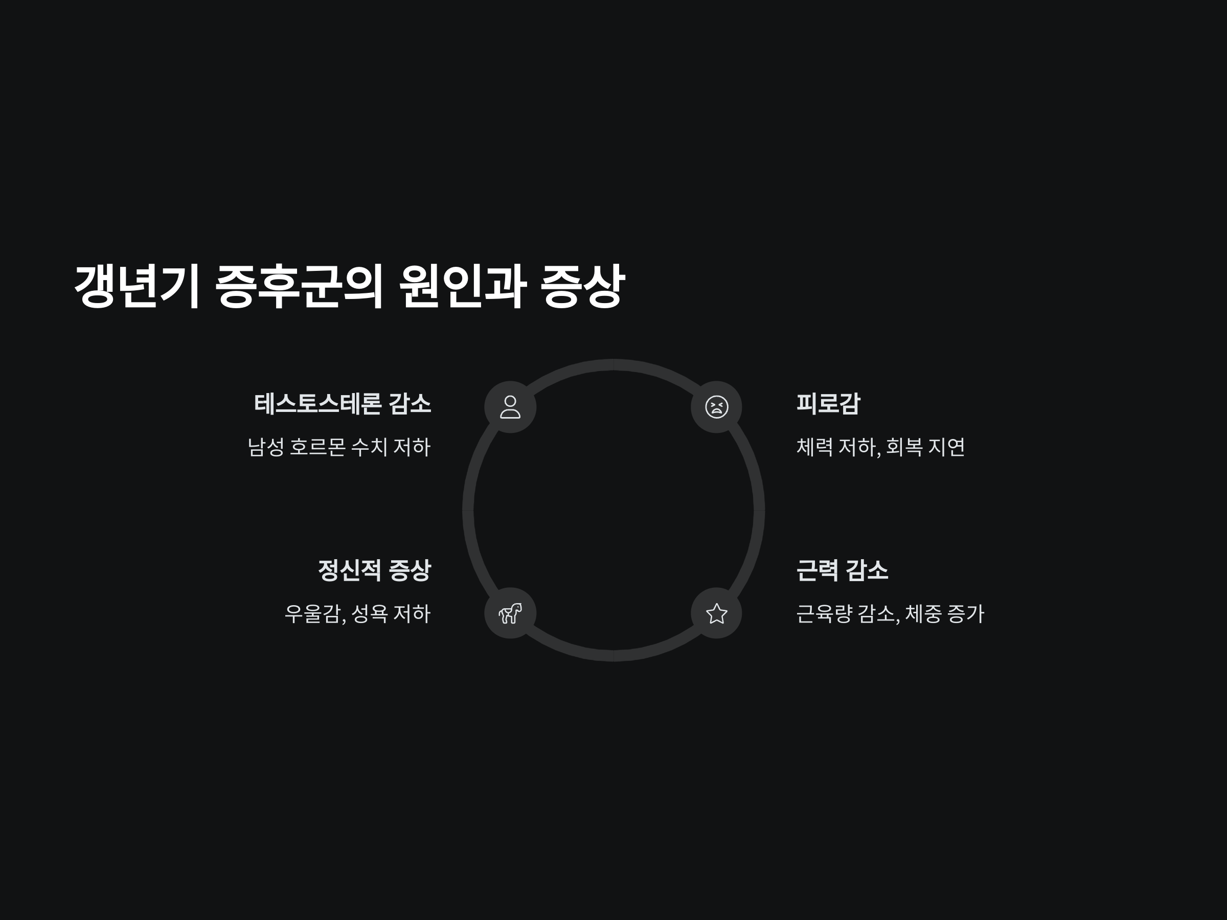 남성 갱년기 증후군의 주요 원인은 테스토스테론 호르몬의 감소입니다. 이 호르몬은 남성의 생리적 변화와 관련이 있으며, 근육량 증가, 성욕 유지, 에너지 수준 등을 조절하는 중요한 역할을 합니다. 나이가 들면서 자연스럽게 테스토스테론 수치는 감소하게 되고, 이로 인해 피로감과 근력 감소가 발생할 수 있습니다.