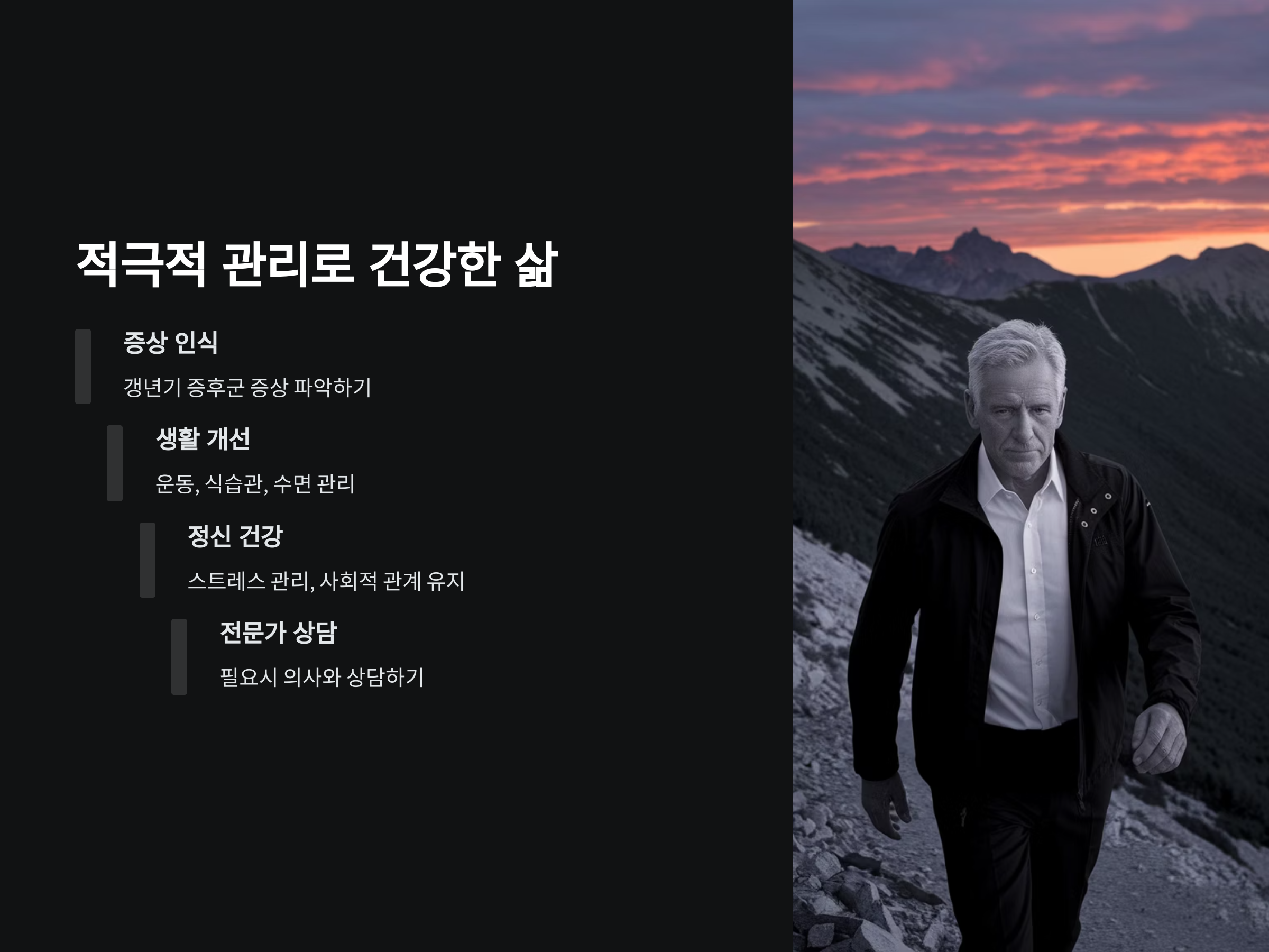 남성 갱년기 증후군은 누구나 겪을 수 있는 자연스러운 생리적 변화입니다. 하지만 이를 효과적으로 관리하고 극복하는 방법을 알면, 피로감과 근력 감소를 예방하고 건강한 삶을 유지할 수 있습니다. 규칙적인 운동, 올바른 식습관, 정신적 안정 등 다양한 방법을 통해 증후군을 관리할 수 있습니다. 갱년기 증후군을 예방하고, 적극적으로 대처함으로써 삶의 질을 높이고 더 나은 미래를 만들어 갈 수 있습니다.