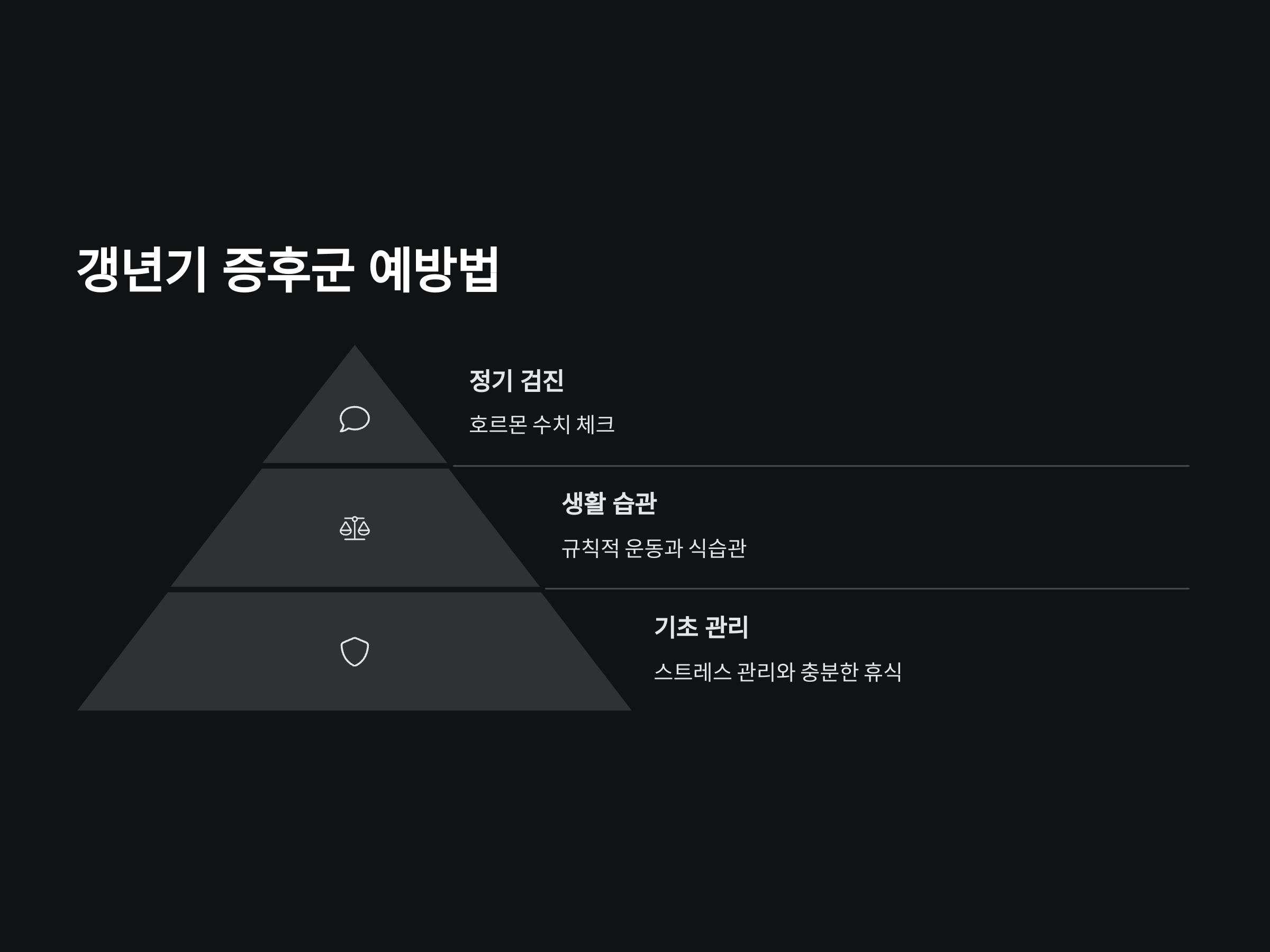 갱년기 증후군은 피할 수 없는 생리적 과정이지만, 예방은 가능합니다. 규칙적인 운동과 건강한 식습관, 스트레스 관리는 남성 갱년기 증후군을 예방하는 데 중요한 역할을 합니다. 또한, 정기적인 건강 검진을 통해 호르몬 수치를 체크하고, 필요한 경우 전문가와 상담을 하는 것도 중요한 예방책입니다.