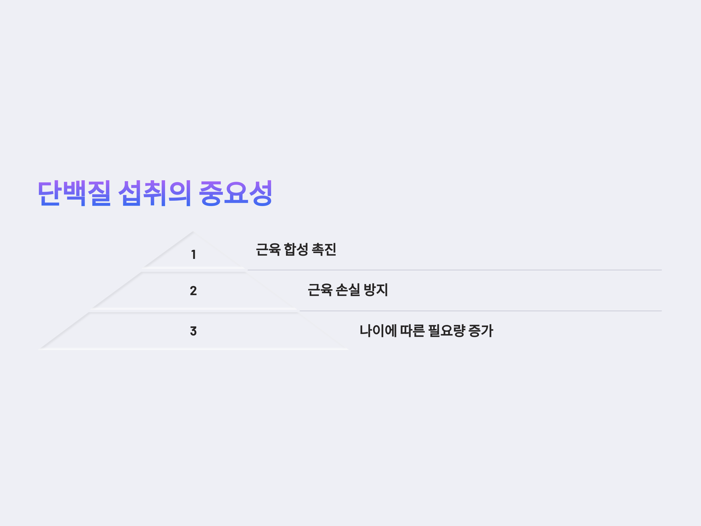 단백질은 근육의 주요 구성 요소로, 근육 합성을 촉진하고 근육 손실을 막는 중요한 역할을 합니다. 특히 노화가 진행될수록 단백질의 필요량이 증가합니다. 나이가 들수록 단백질 합성 능력이 저하되기 때문에, 더 많은 단백질을 섭취해야만 근육을 유지할 수 있습니다.