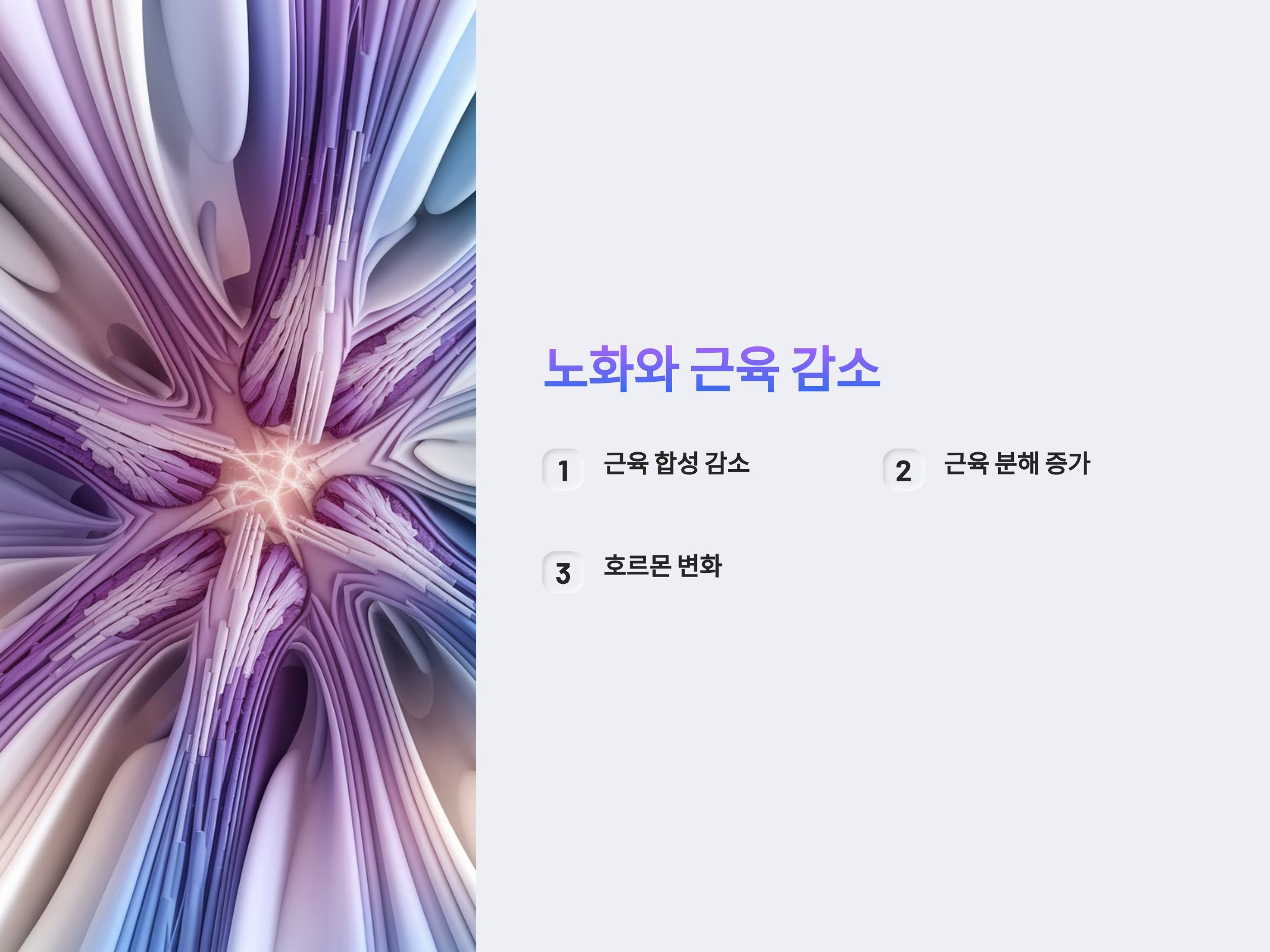 노화에 따른 근육 감소는 자연스러운 현상이지만, 이를 예방하거나 늦추는 방법은 분명히 존재합니다. 나이가 들면서 우리 몸은 근육의 합성 속도를 감소시키고, 분해 속도는 증가하게 됩니다. 이로 인해 근육량이 서서히 줄어들게 됩니다. 또한, 호르몬의 변화, 특히 테스토스테론과 성장 호르몬의 감소가 근육 감소에 영향을 미칩니다. 근육량 감소는 단순히 미적인 문제가 아니라, 신체의 기능을 저하시켜 일상적인 활동을 어려워지게 만들 수 있습니다.