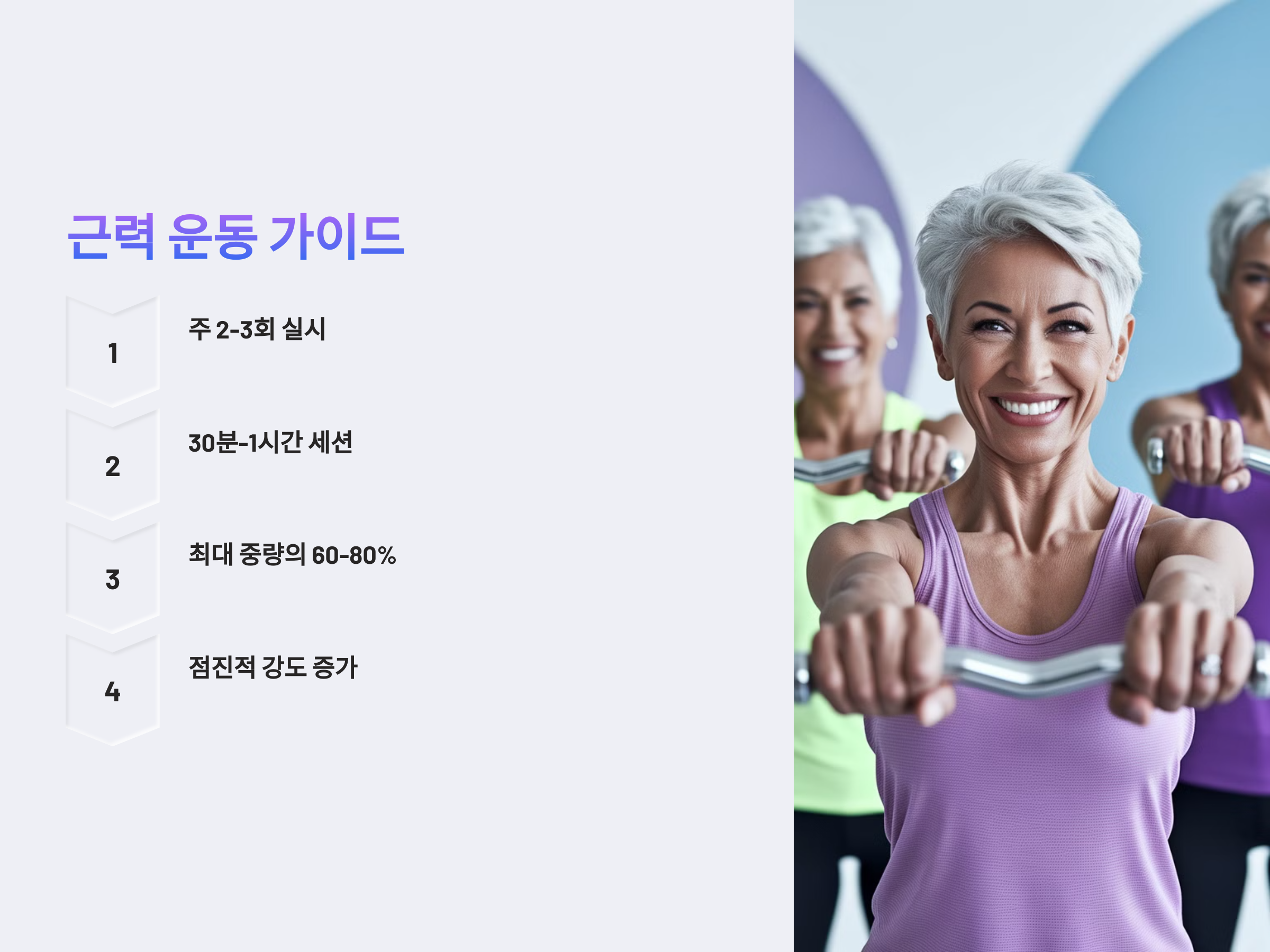 근력 운동은 다양한 방식으로 수행할 수 있습니다. 예를 들어, 덤벨이나 바벨을 이용한 웨이트 트레이닝, 체중을 이용한 푸시업, 스쿼트 등의 운동이 있습니다. 이러한 운동은 근육에 스트레스를 주고, 근육 섬유를 미세하게 파괴한 후 재생되는 과정을 통해 근육량을 증가시킵니다. 이 과정은 나이가 들어도 계속해서 반복되어야 합니다.