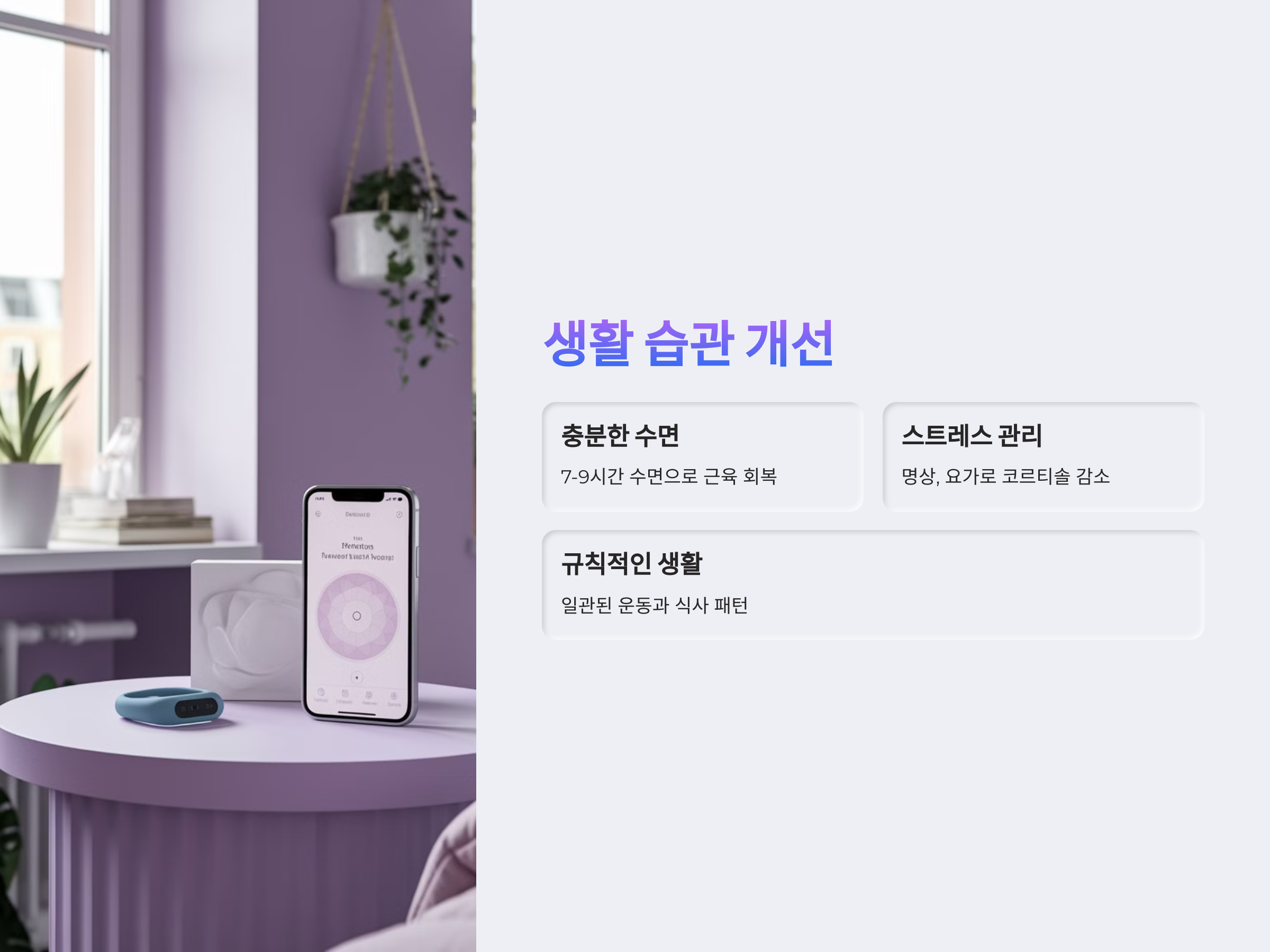 수면은 근육 회복에 중요한 역할을 합니다. 수면 중에 성장 호르몬이 분비되어 근육이 재생되고 성장합니다. 하루 7~9시간의 충분한 수면을 취하는 것이 필수적입니다. 또한, 수면의 질을 높이기 위해 규칙적인 수면 패턴을 유지하고, 스마트폰이나 전자기기 사용을 자제하는 것이 좋습니다.