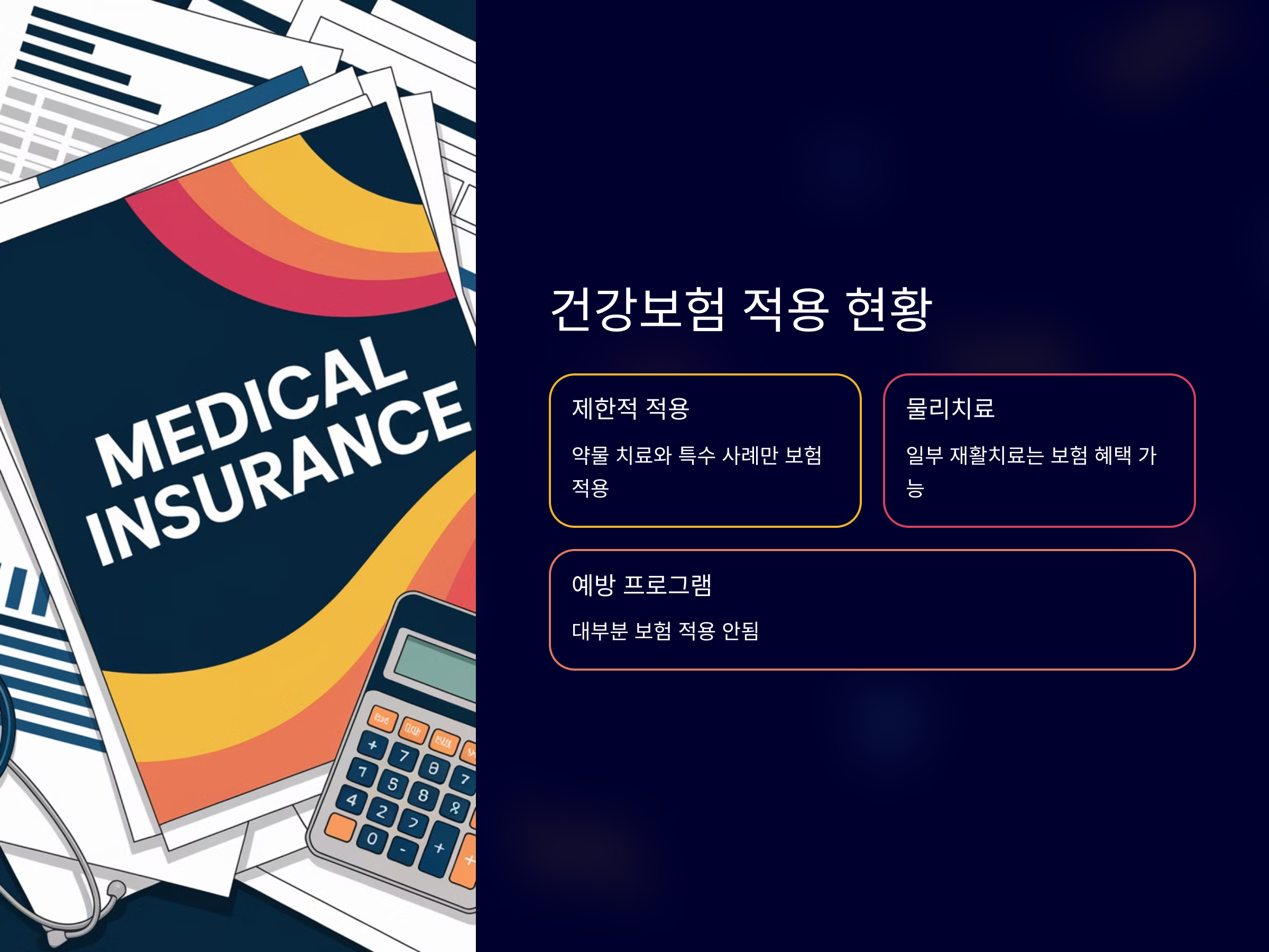 근감소증의 치료를 위해 물리치료나 재활치료가 필요한 경우, 일정 부분 보험 적용이 될 수 있습니다. 다만, 운동 치료나 일반적인 예방 프로그램에 대한 건강보험 적용은 제한적이기 때문에, 많은 환자들이 이를 치료하기 위해 추가적인 비용을 부담해야 하는 실정입니다.