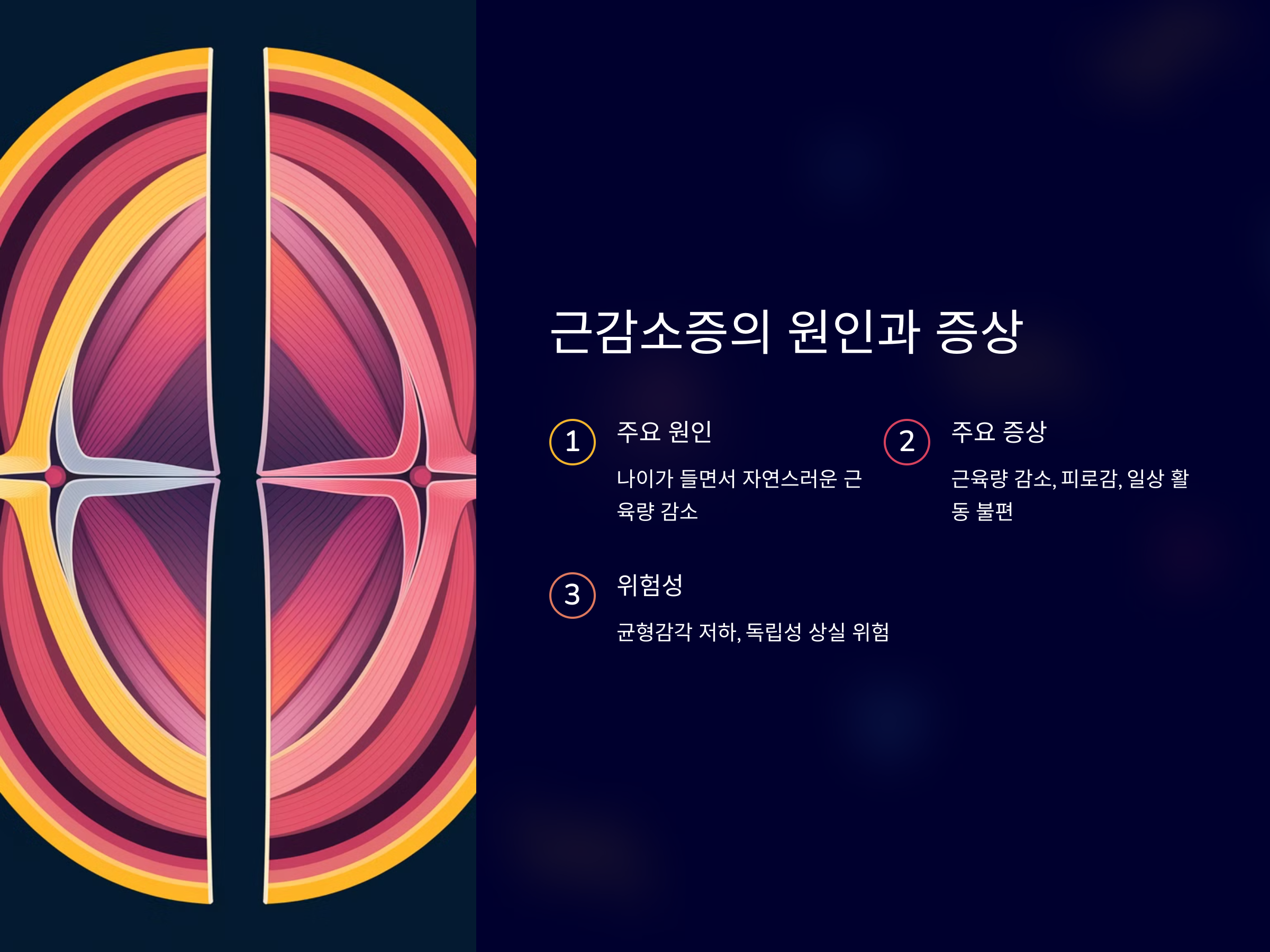 근감소증은 주로 나이와 관련이 깊습니다. 나이가 들면서 체내 근육량이 자연스럽게 감소하게 되고, 이는 근력을 약화시켜 여러 가지 기능적인 저하를 초래합니다. 근감소증은 단순히 근육량 감소에 그치지 않고, 몸의 균형 감각, 걸음 속도, 일상 생활의 독립성에도 큰 영향을 미칠 수 있습니다.