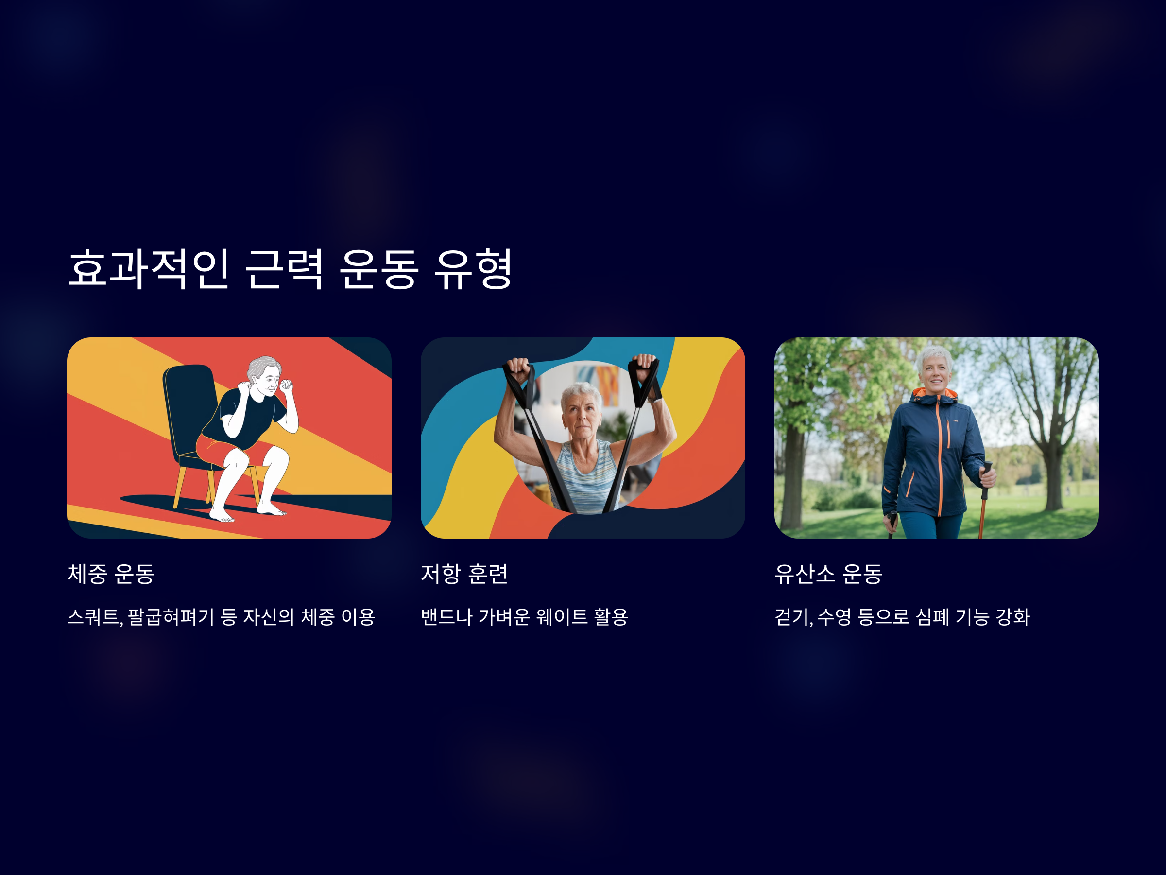 근력 강화 운동은 저항 훈련, 일상 생활에서 실천할 수 있는 체중 운동 등을 포함하며, 걷기와 같은 유산소 운동도 도움이 될 수 있습니다. 이를 통해 근육을 강화하고, 체력을 향상시키며, 건강한 체중을 유지할 수 있습니다.